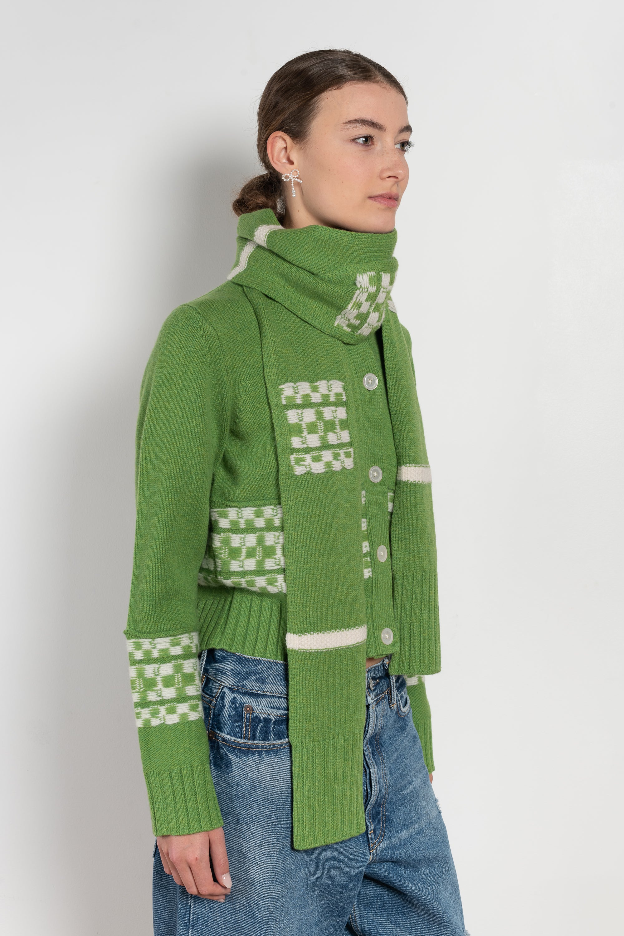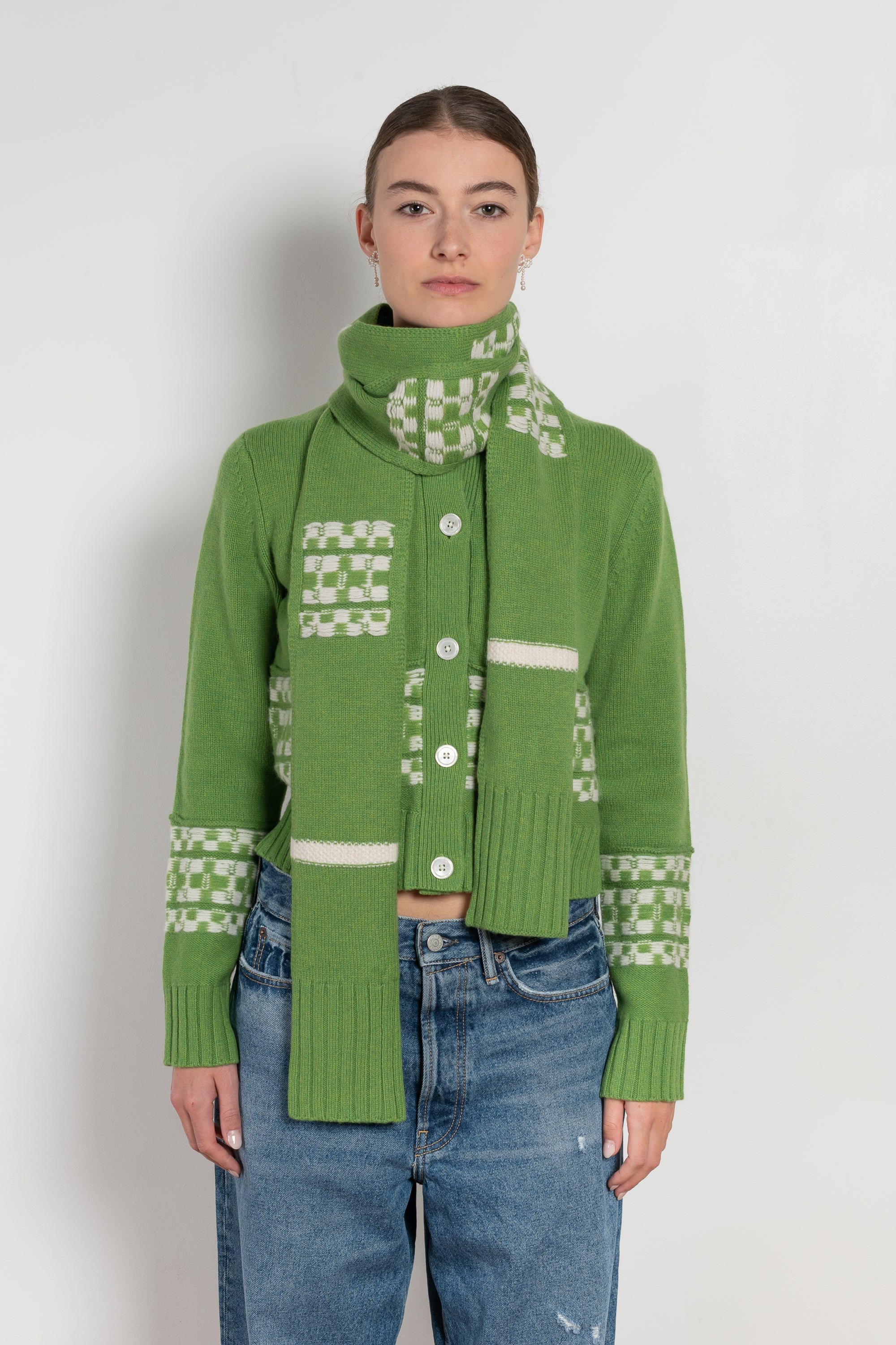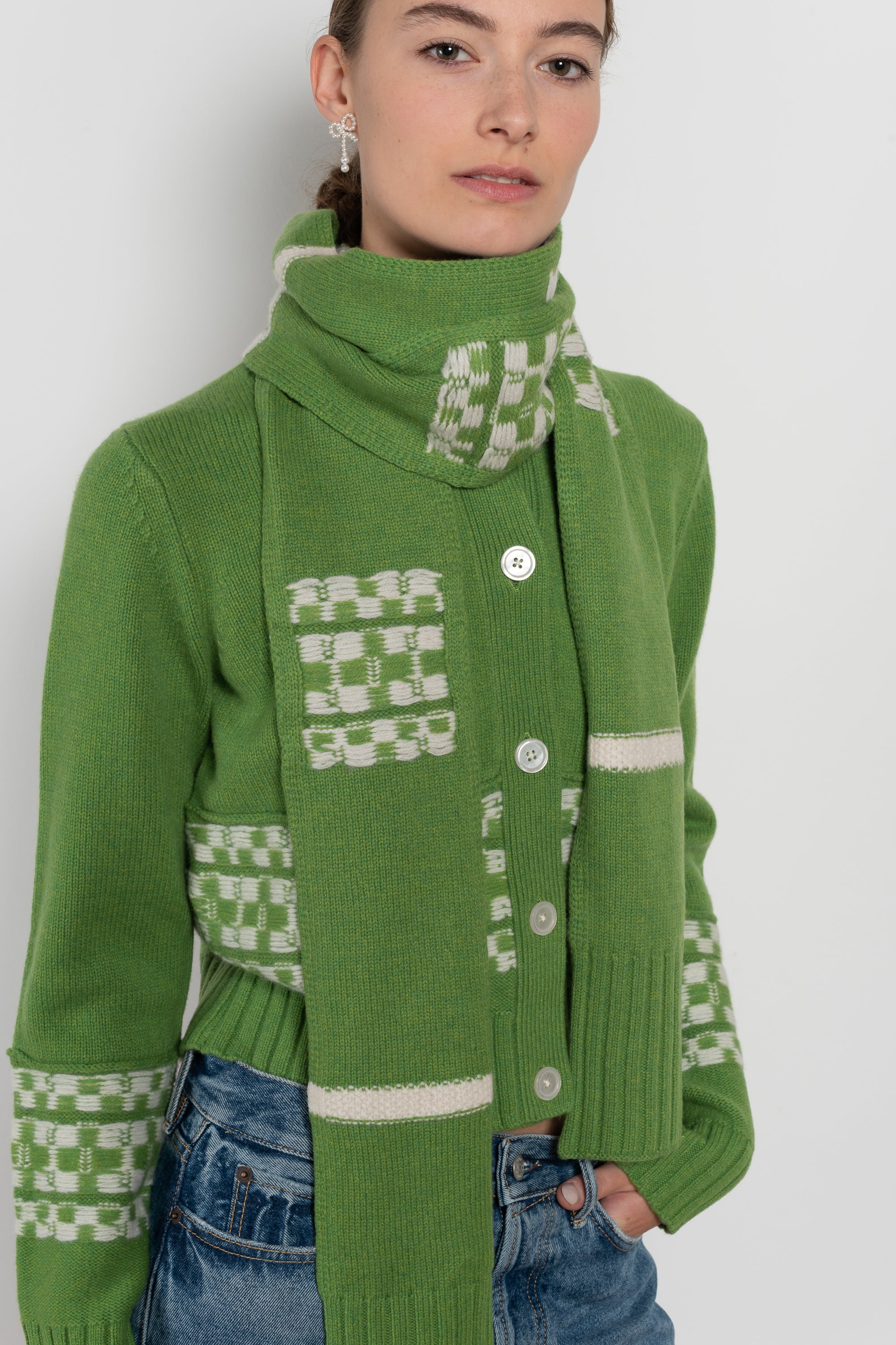 The Doig Scarf by B.B.Wallace features an ivory geometric pattern and ribbed edges for a structured finish. Its elongated shape allows for versatile styling, whether wrapped or draped.