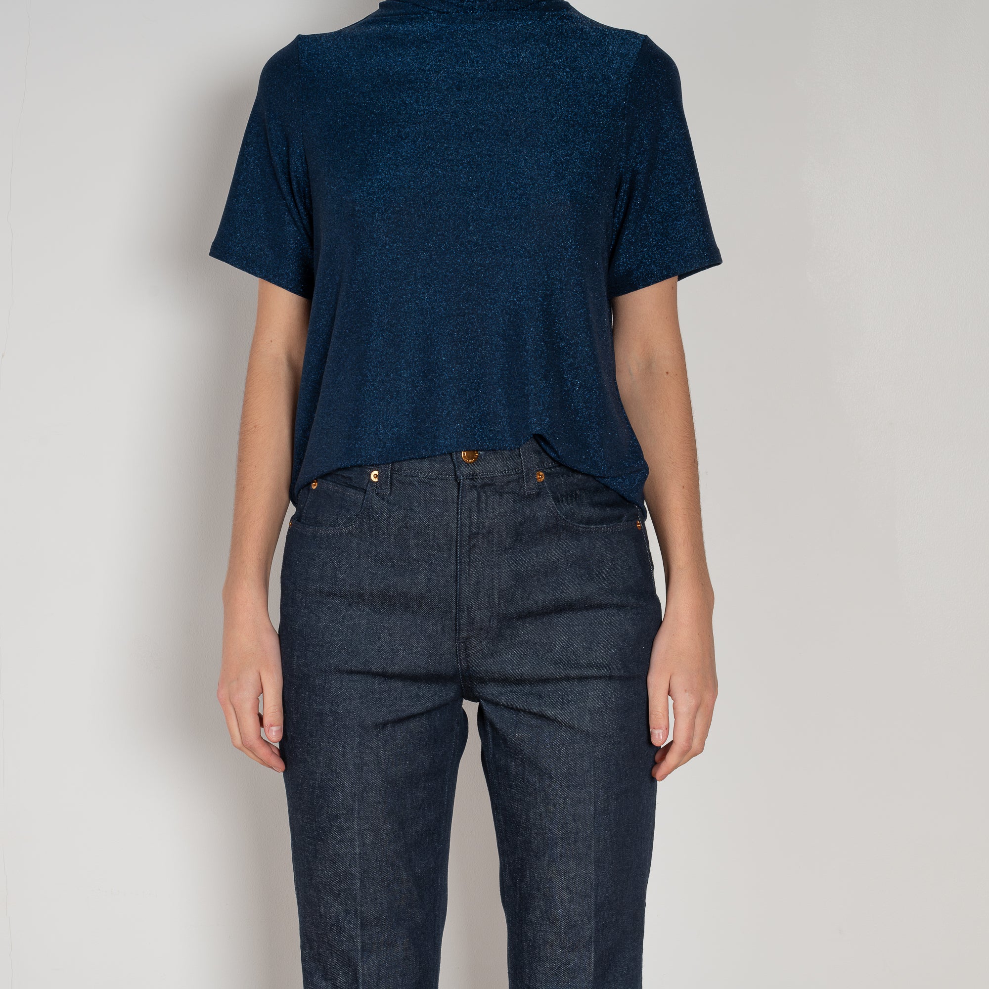 The Cowl Tee by Jamie Haller is a relaxed tee shirt shape with a built up neckline that drapes into a petite cowl. Tailored in Italian glitter knit jersey.