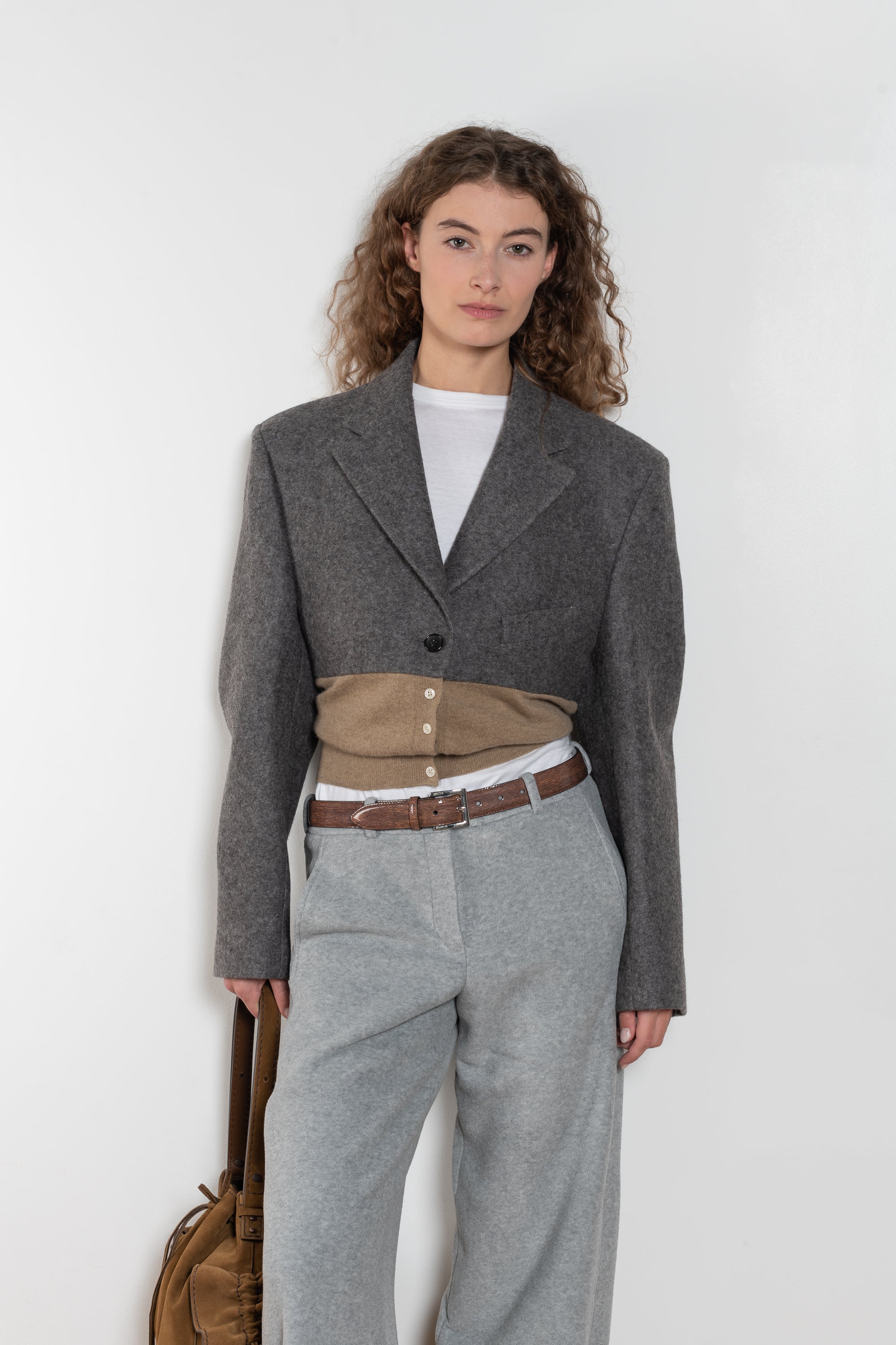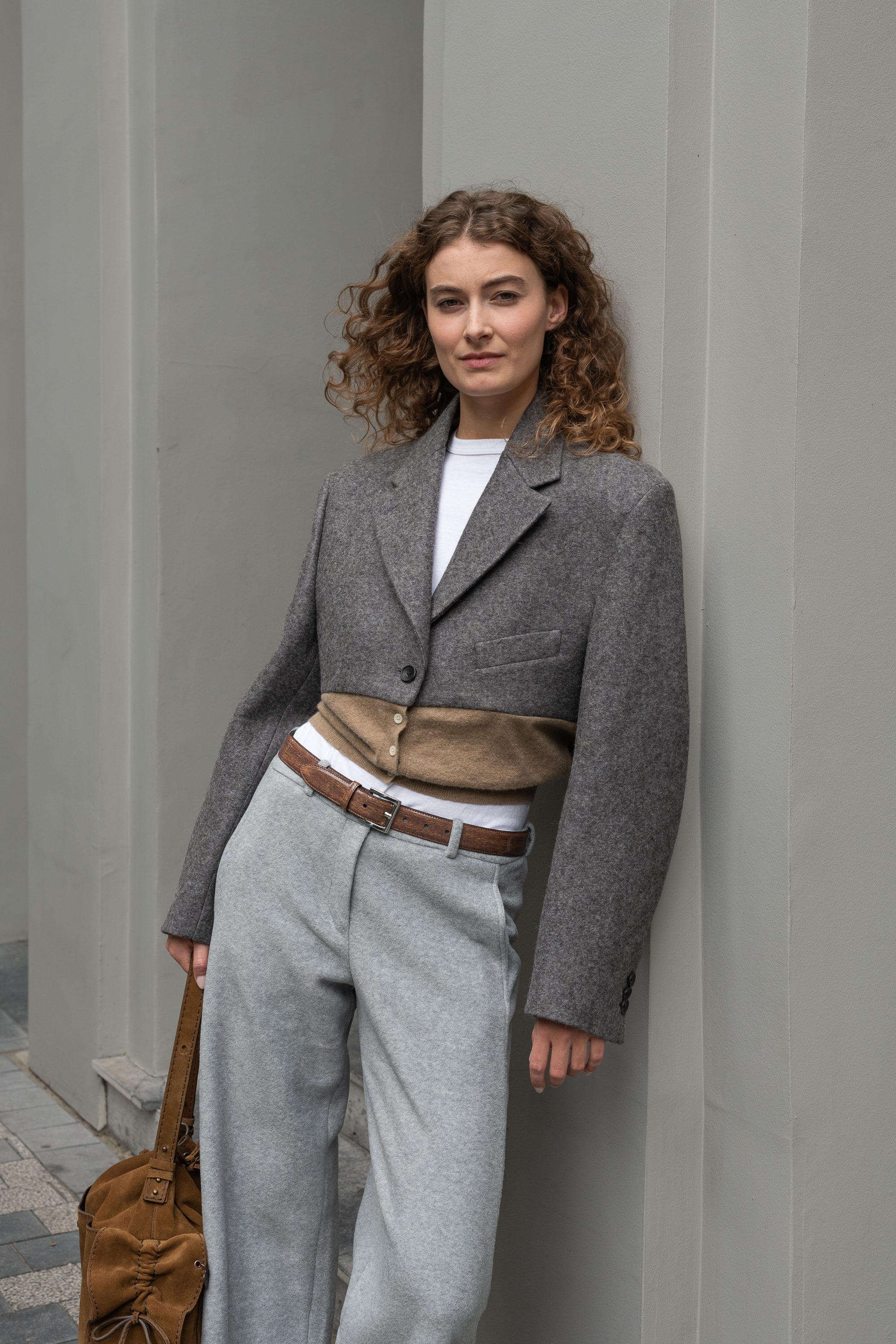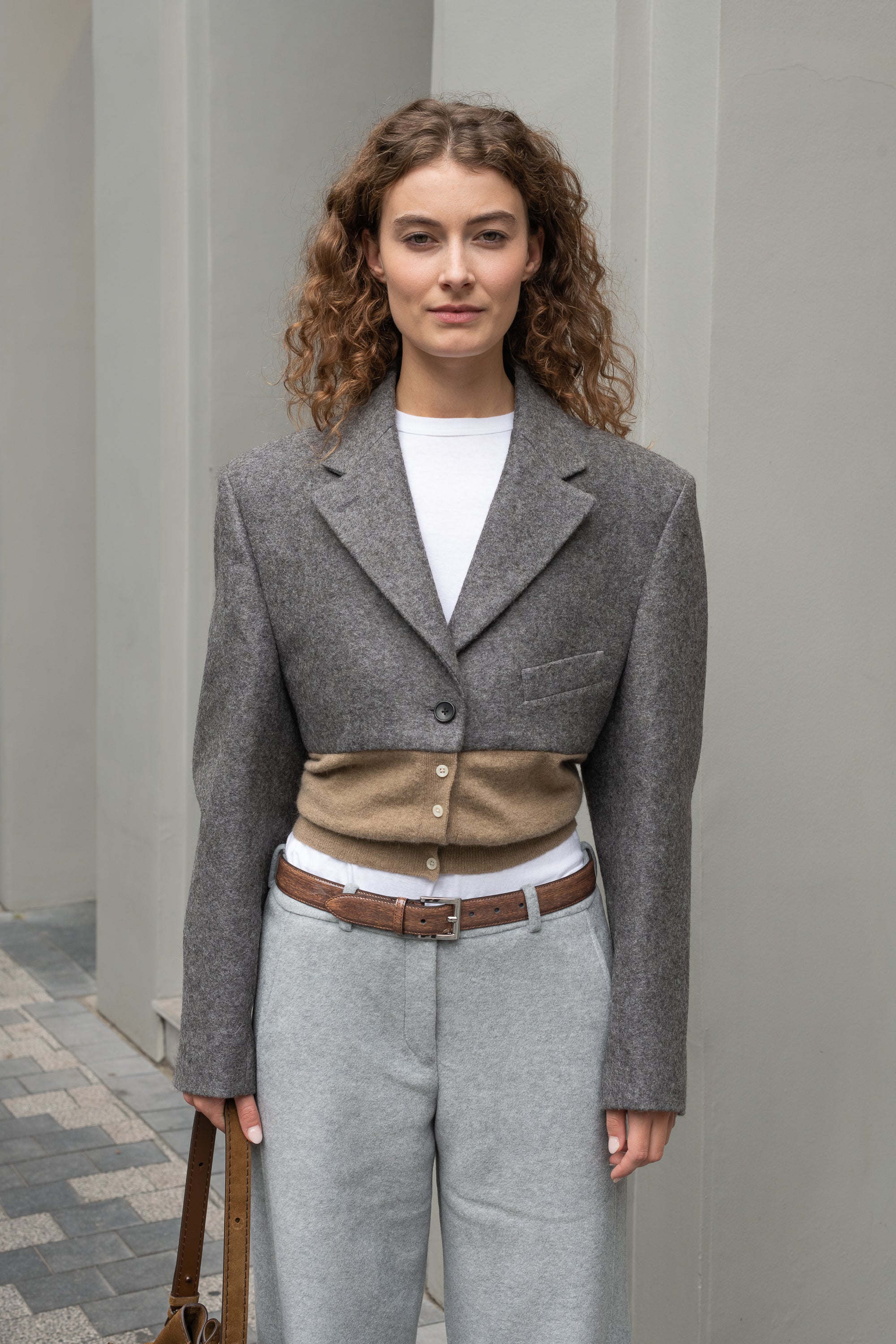 The Billy Jacket by Julie Kegels is a Mixed media cropped wool blazer.The contrast between the single-breasted blazer and cardigan adds unexpected sophistication, while button closures and a chest welt pocket provide the perfect finishing touches.