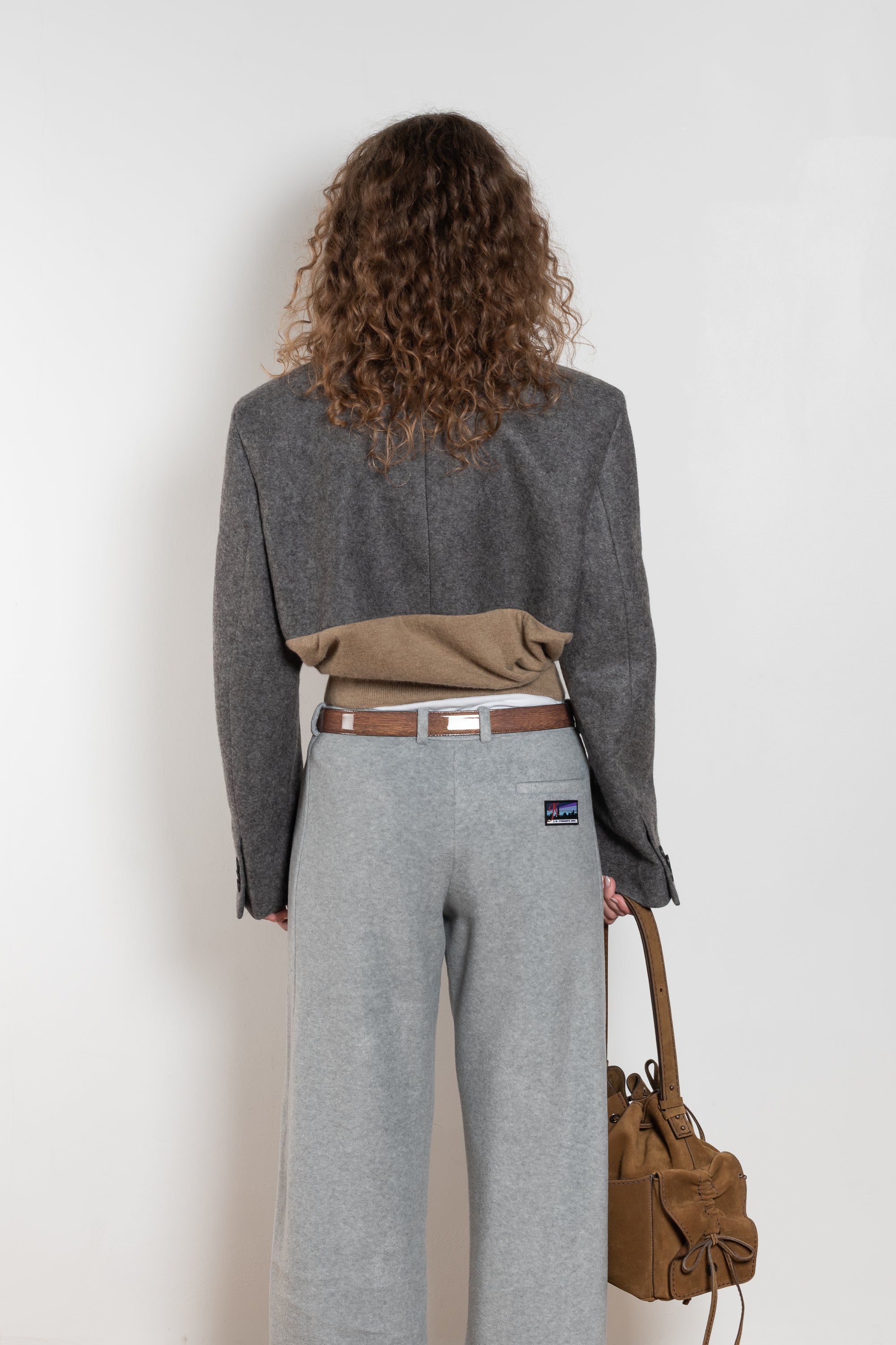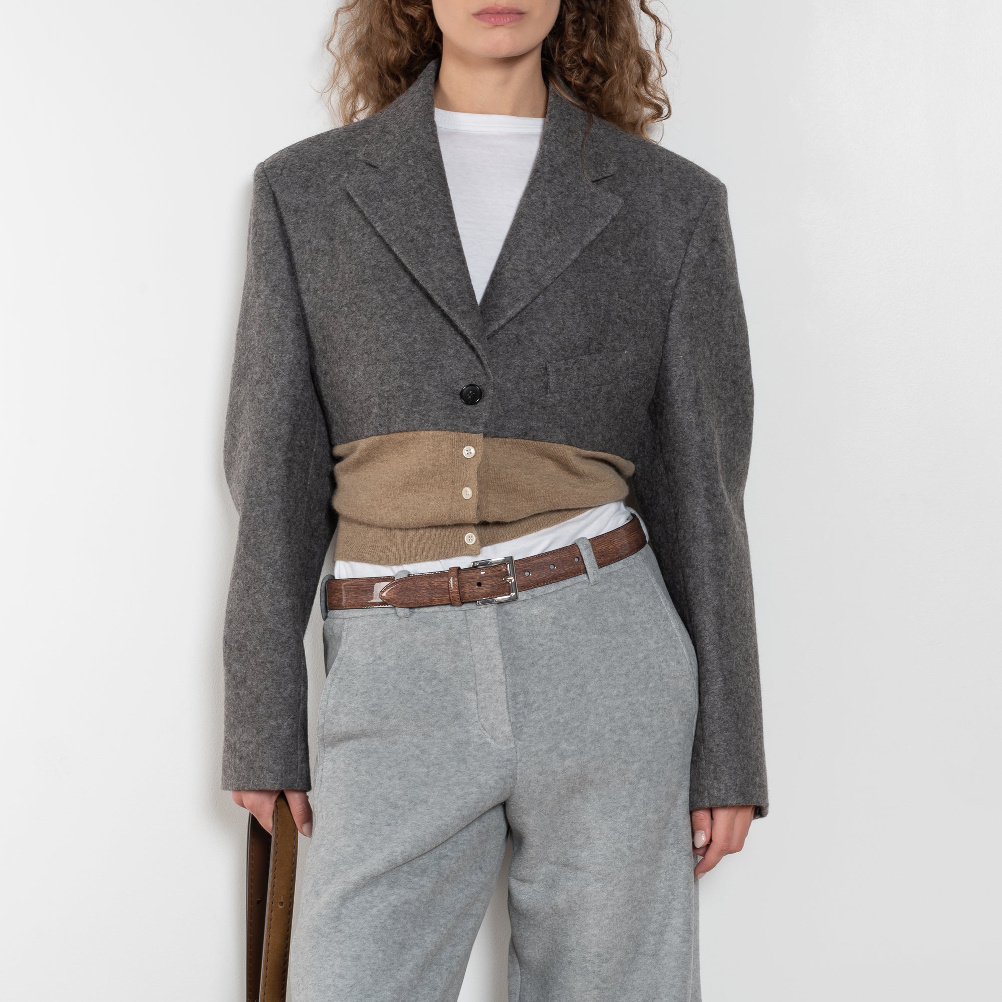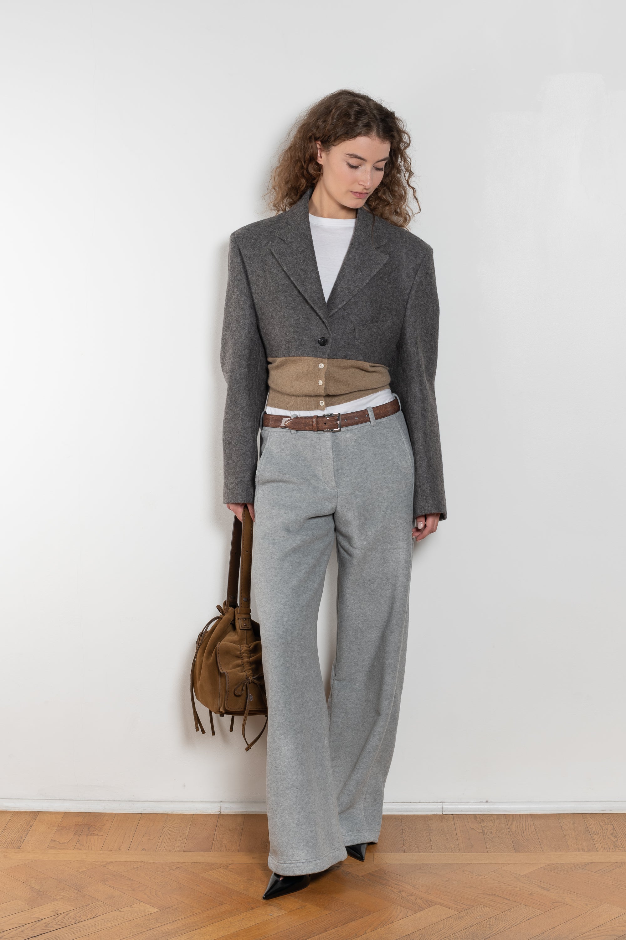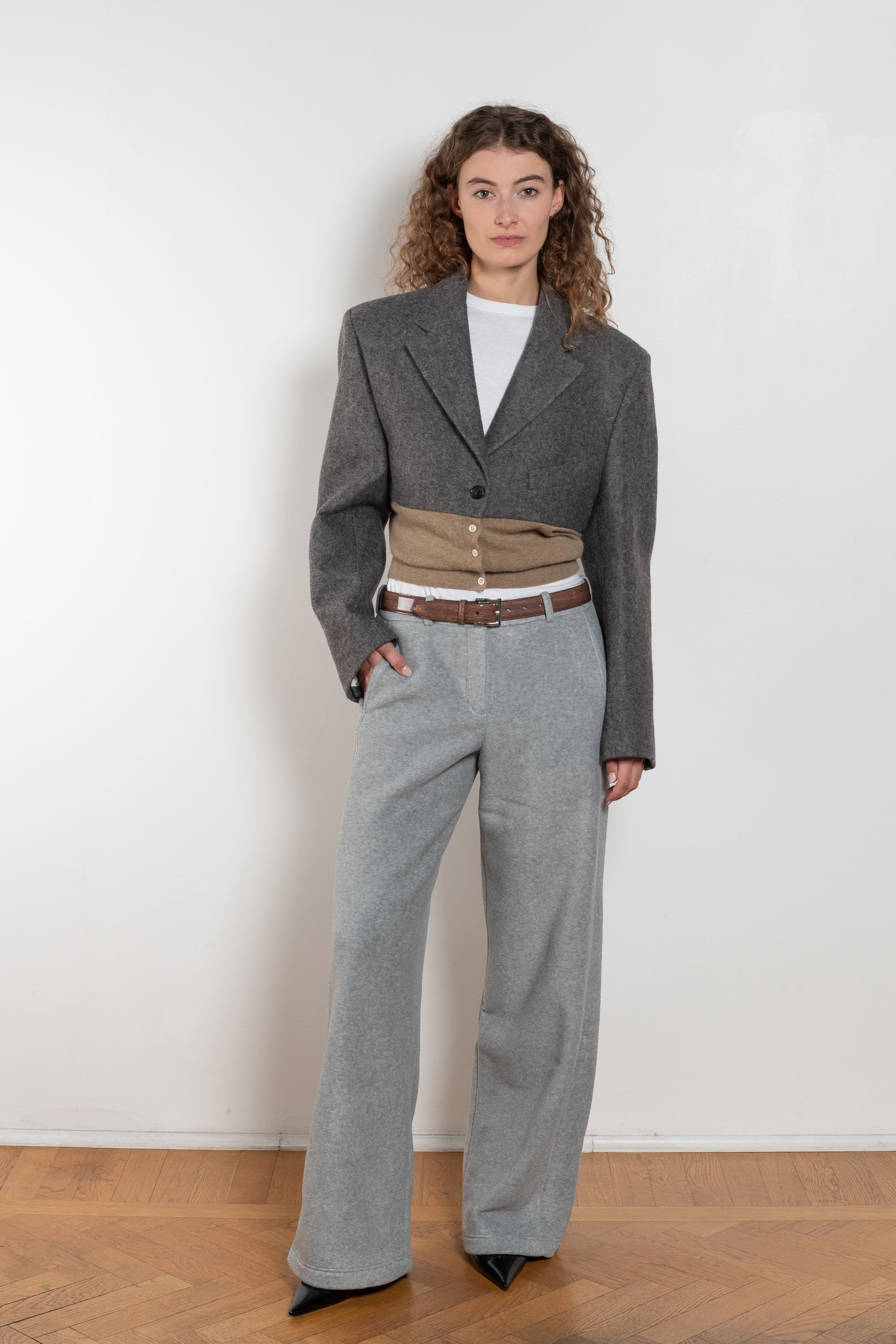 The Billy Jacket by Julie Kegels is a Mixed media cropped wool blazer.The contrast between the single-breasted blazer and cardigan adds unexpected sophistication, while button closures and a chest welt pocket provide the perfect finishing touches.