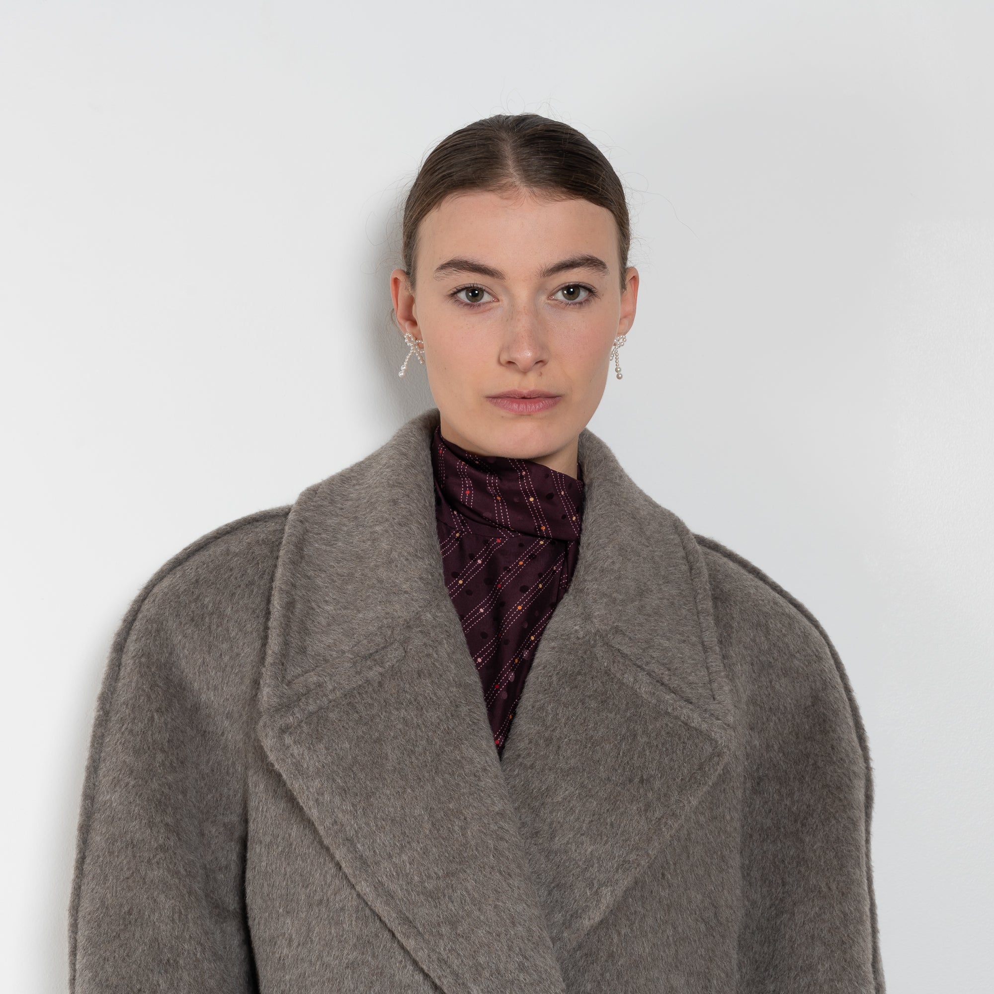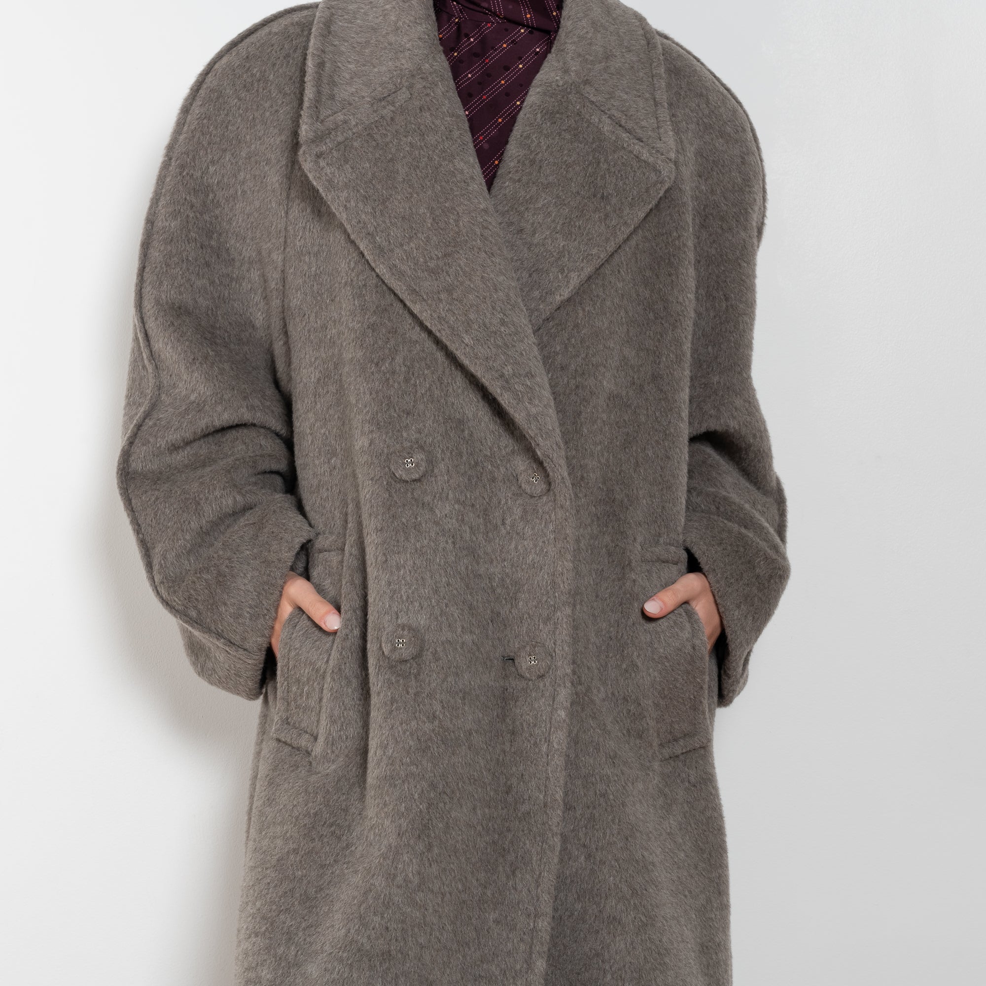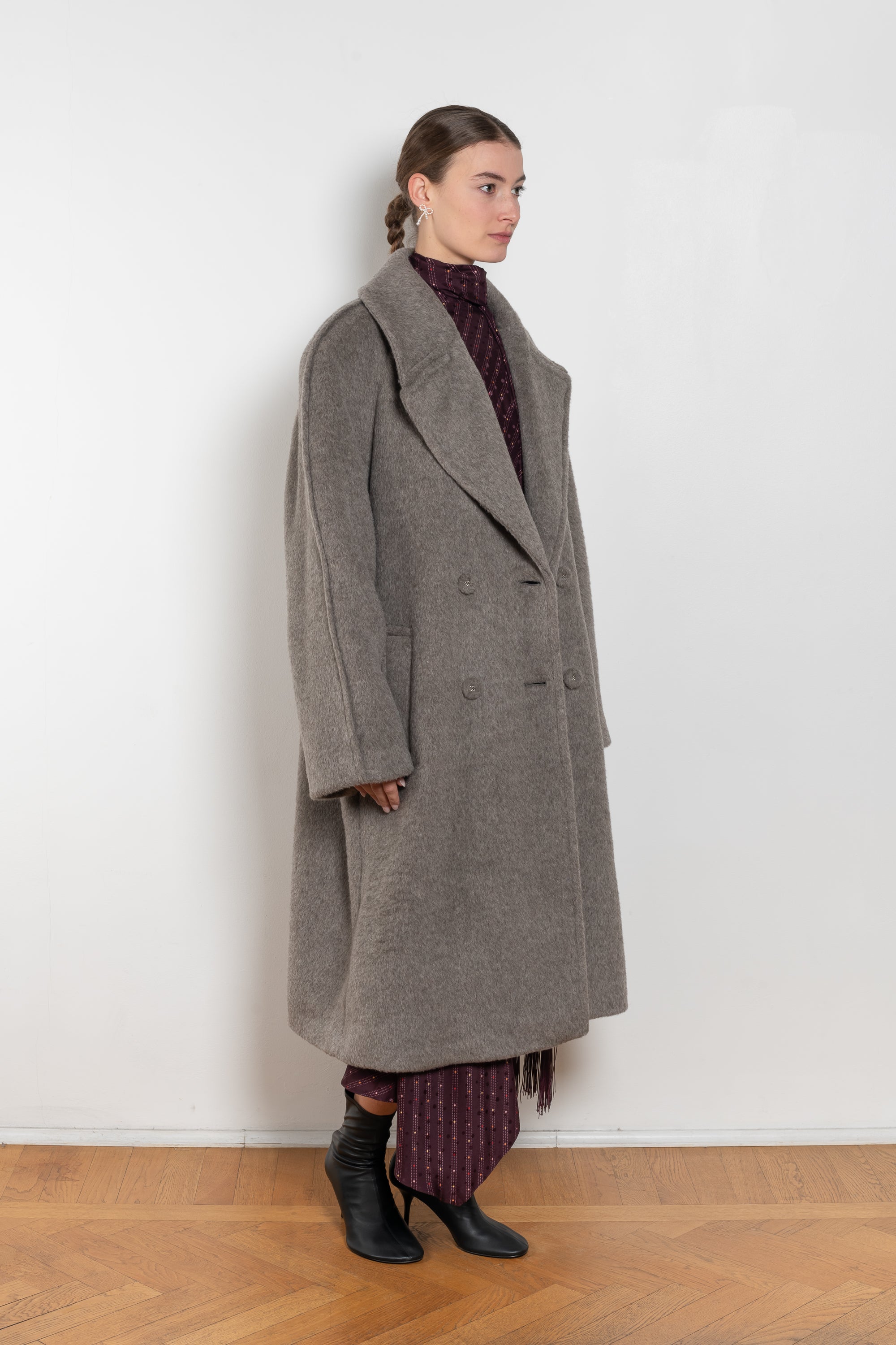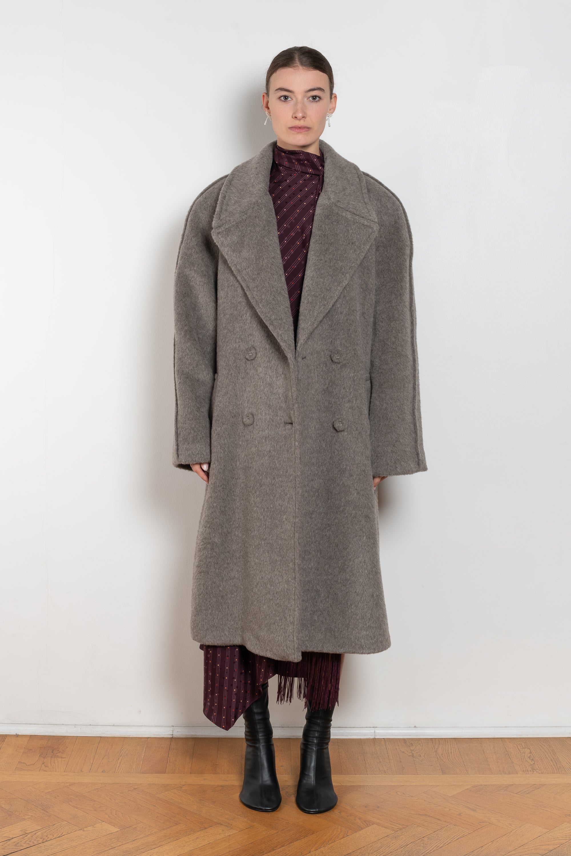 The Double Breasted Wool Jacket by ACNE STUDIOS crafted from a soft alpaca-wool blend with a subtle shine and smooth feel. Designed with covered button closure, front pockets, and finished with an Acne Studios logo label at the cuff. Cut to a relaxed fit and falls below the knee.
