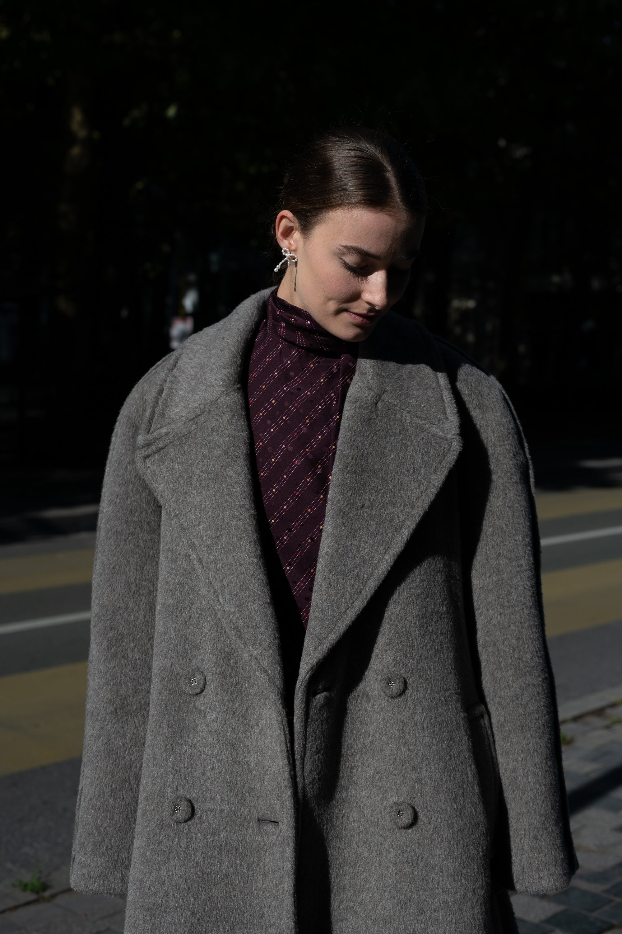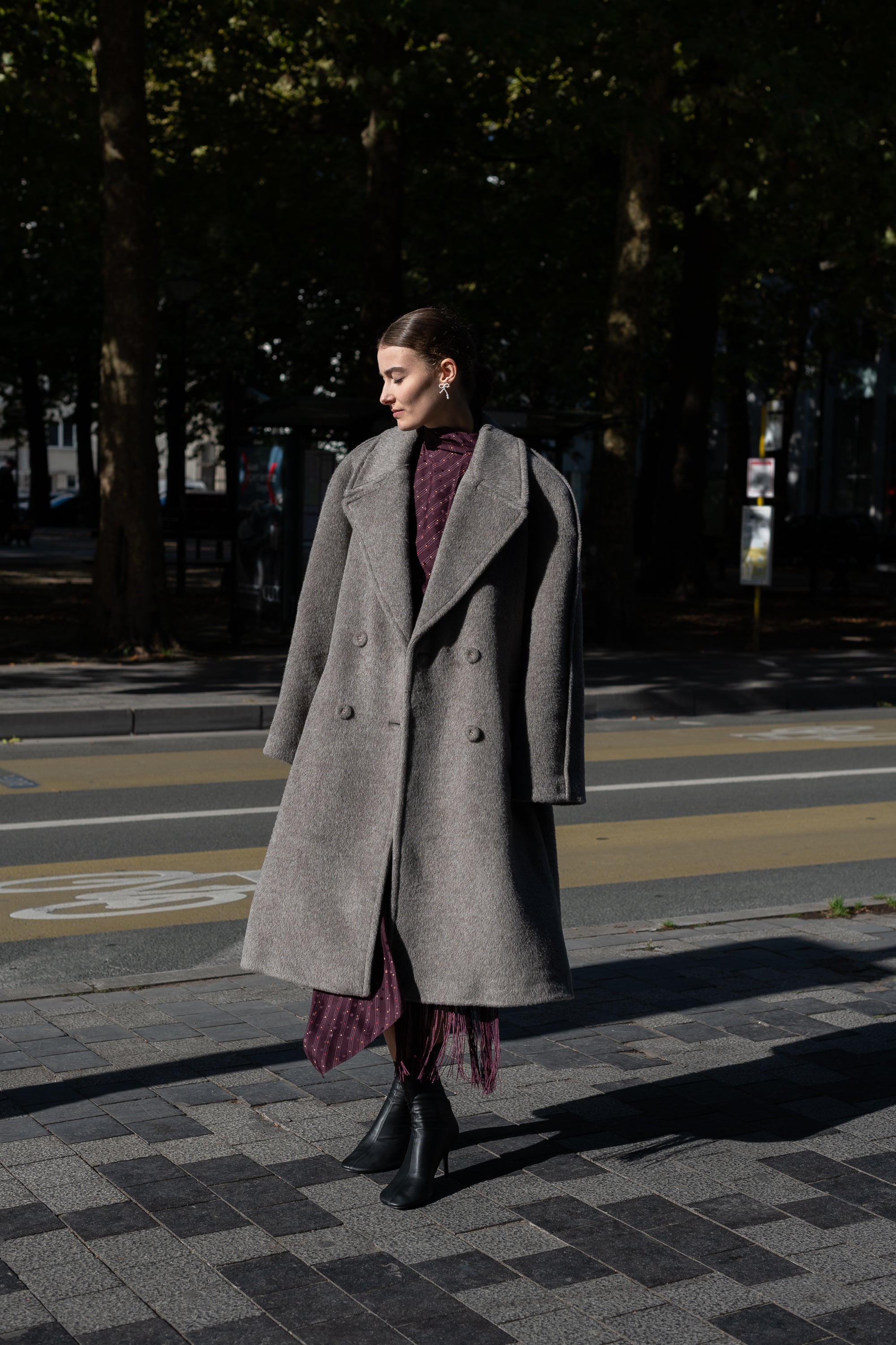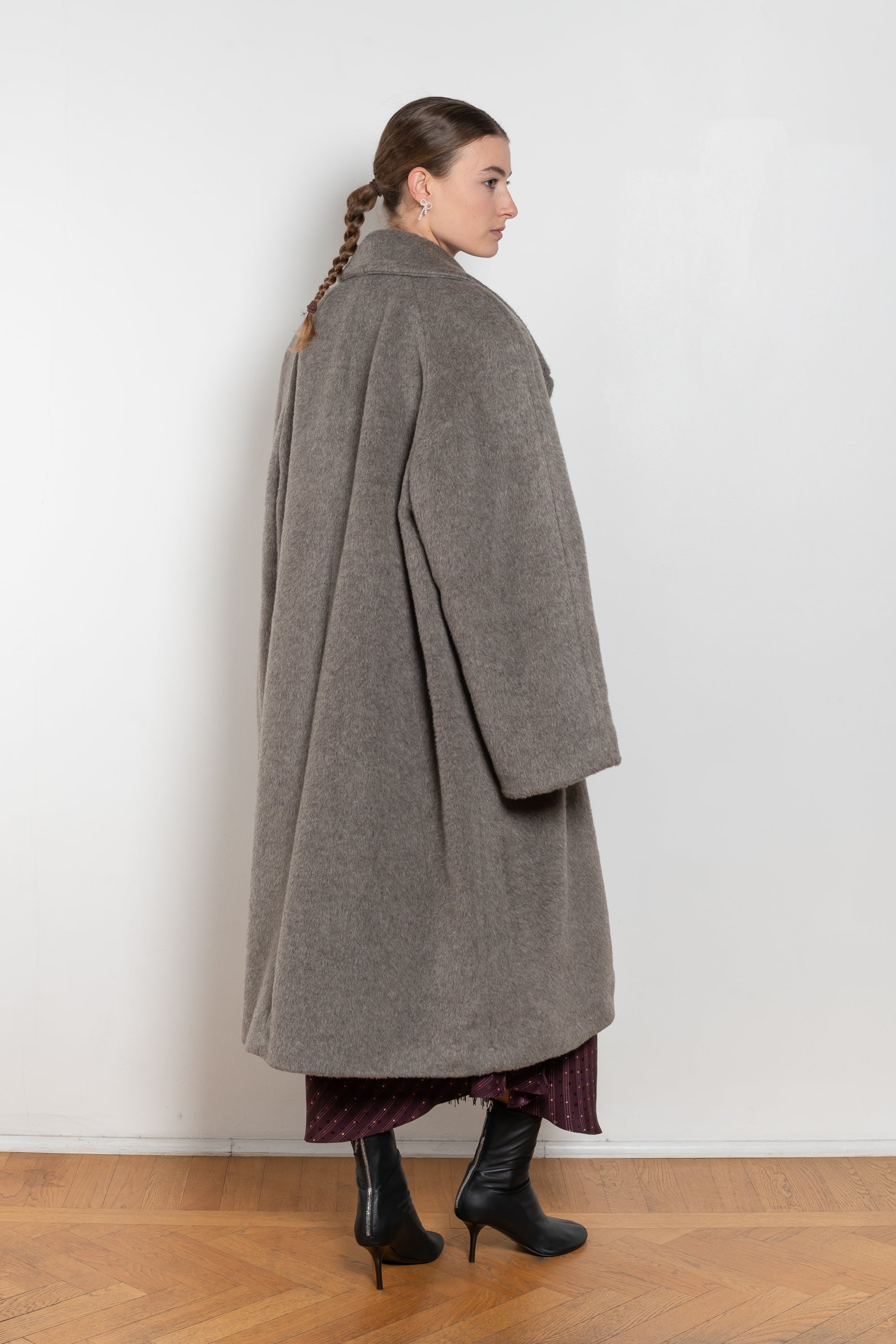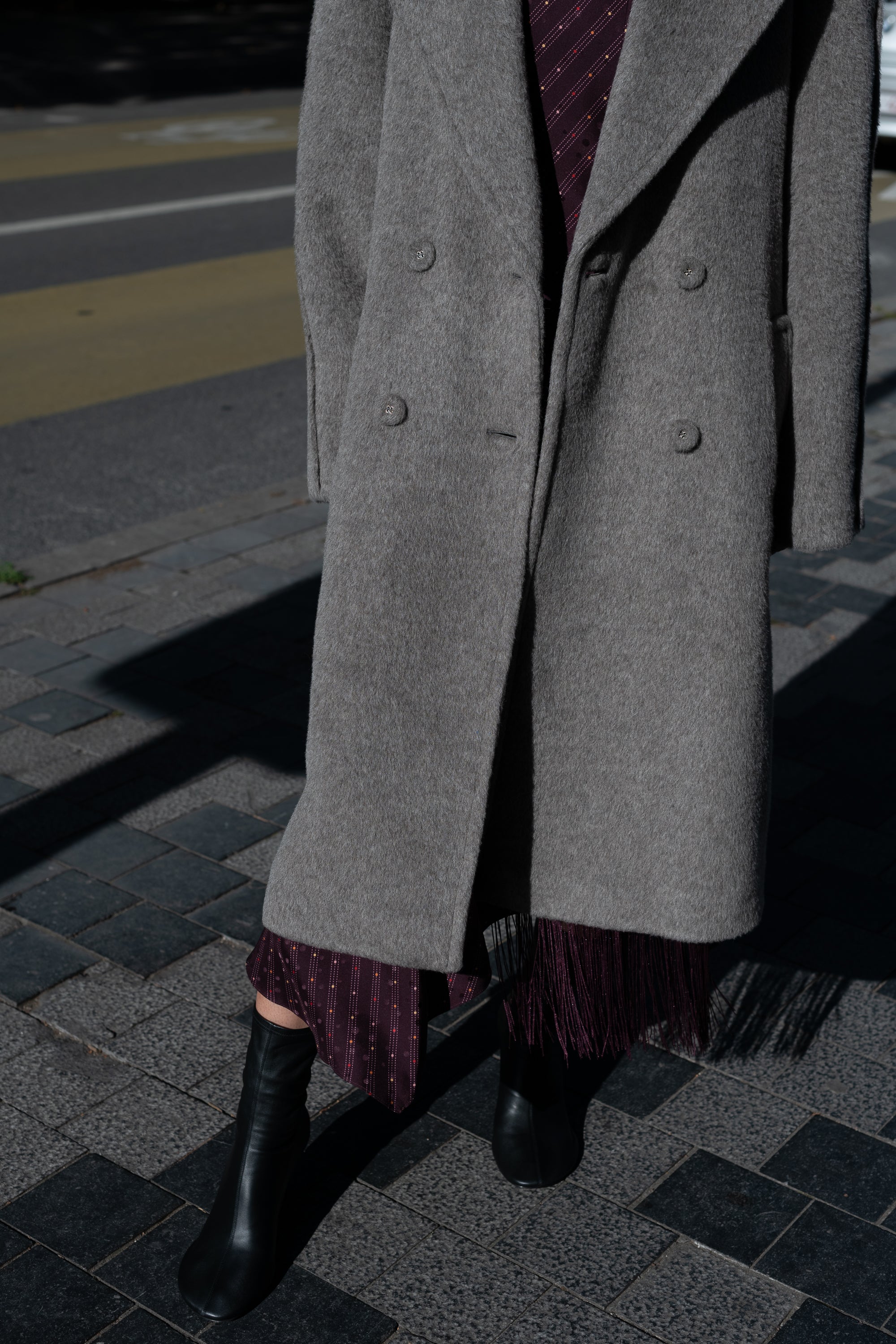 The Double Breasted Wool Jacket by ACNE STUDIOS crafted from a soft alpaca-wool blend with a subtle shine and smooth feel. Designed with covered button closure, front pockets, and finished with an Acne Studios logo label at the cuff. Cut to a relaxed fit and falls below the knee.