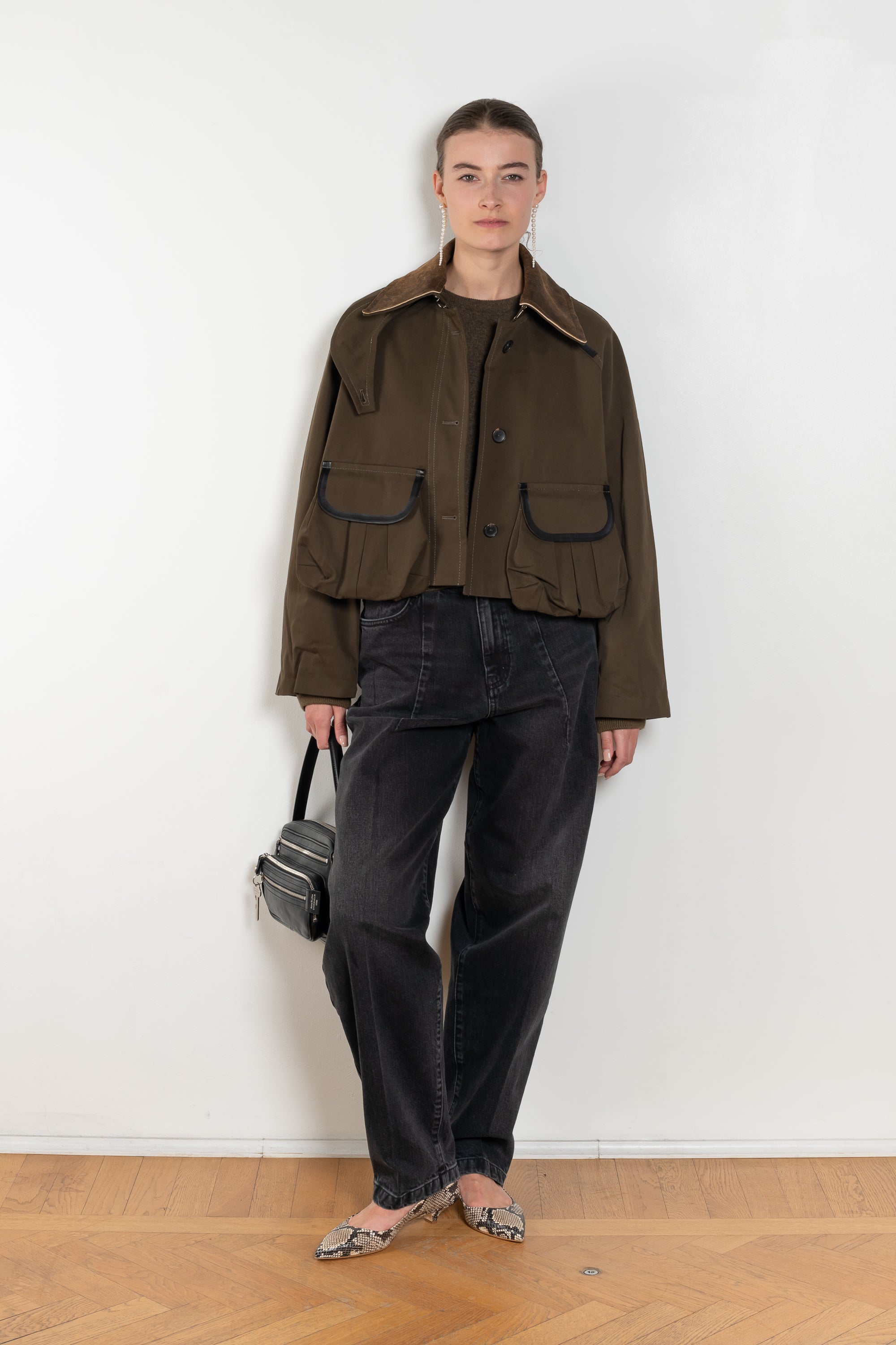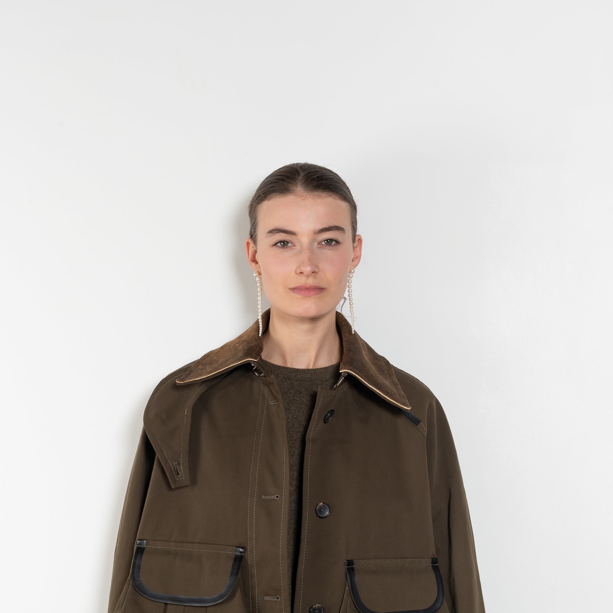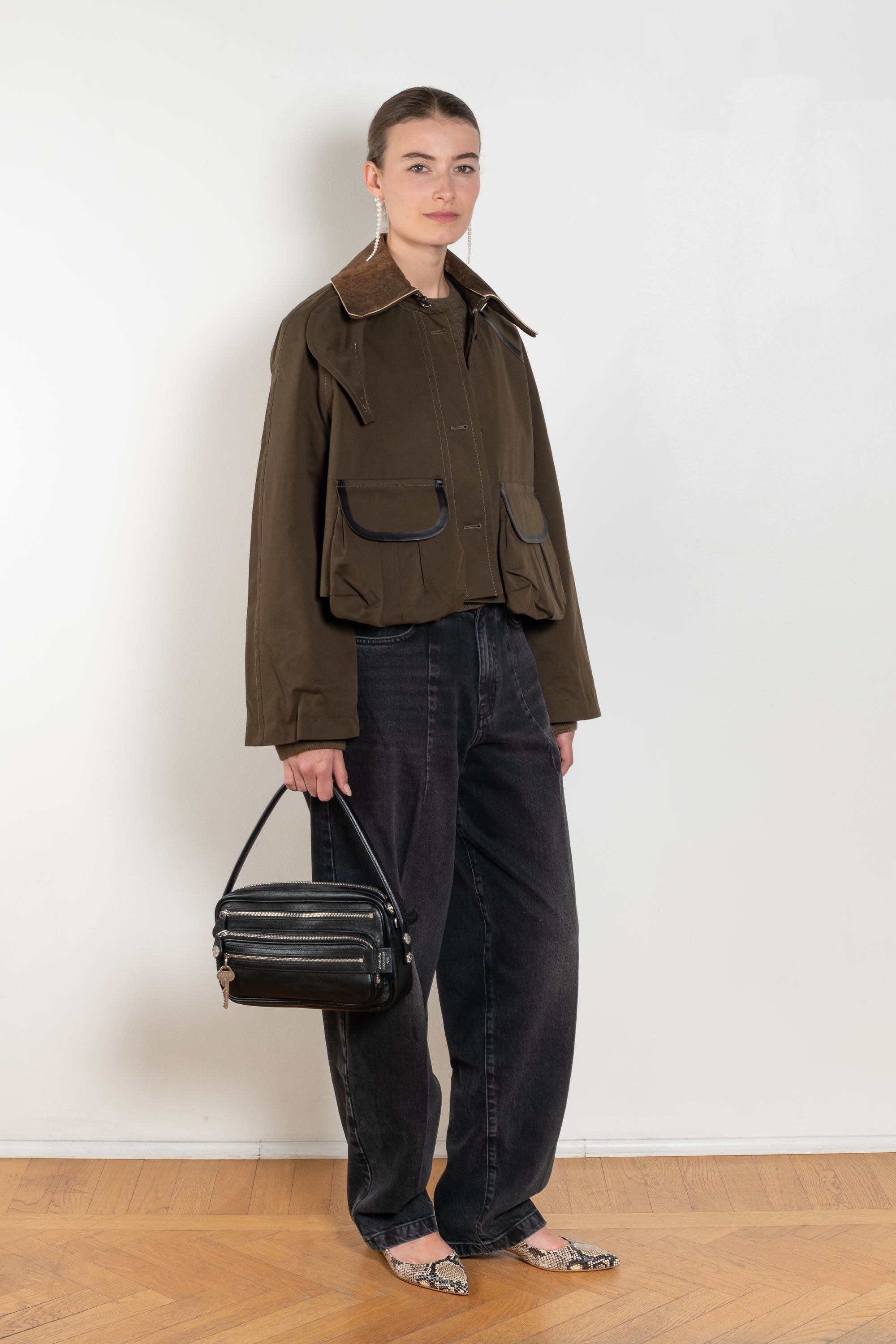 The Precious Cargo Jacket by Nackiye is a parka jacket with hand draped semi attached voluminous pockets and a leather collar. Detachable scalloped piece at the neck for a polished look, whilst the arms have elbow patches