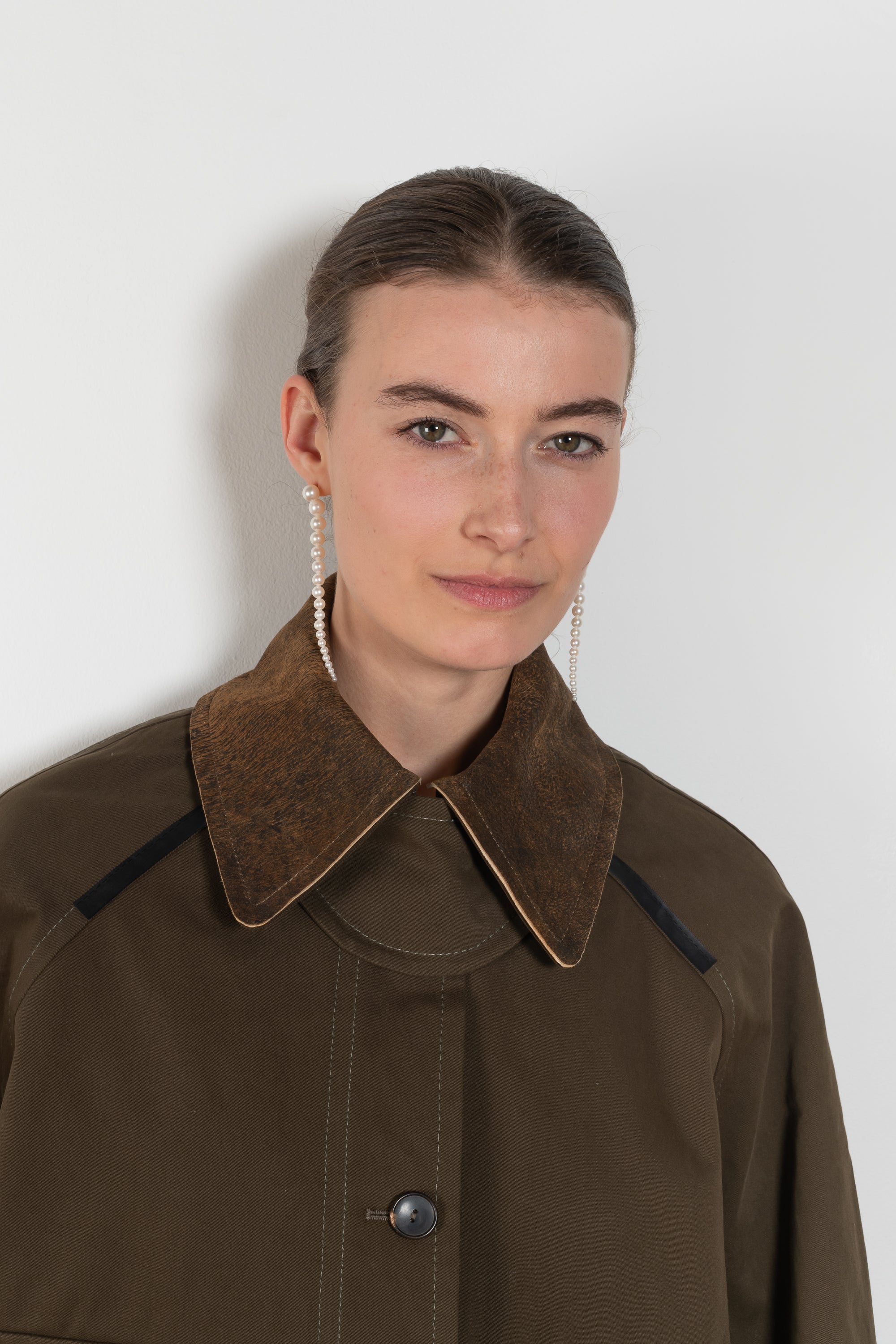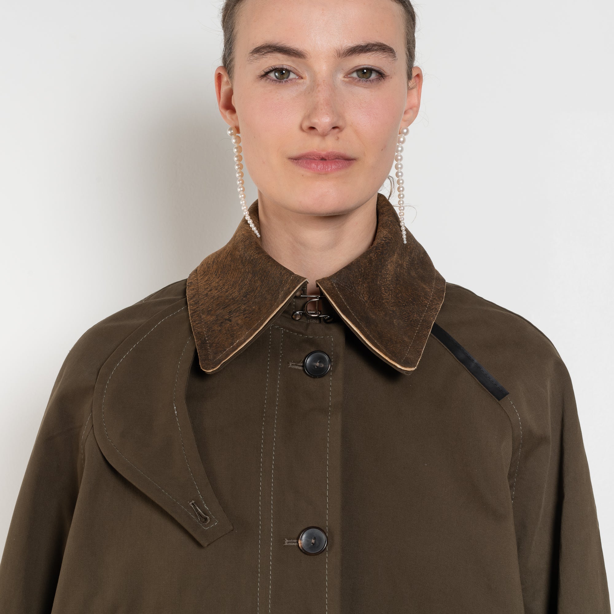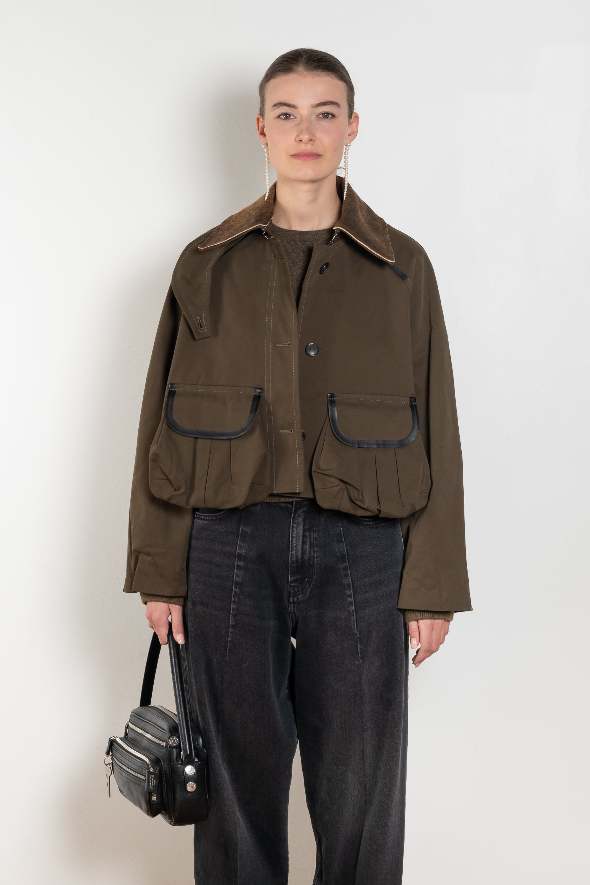 The Precious Cargo Jacket by Nackiye is a parka jacket with hand draped semi attached voluminous pockets and a leather collar. Detachable scalloped piece at the neck for a polished look, whilst the arms have elbow patches