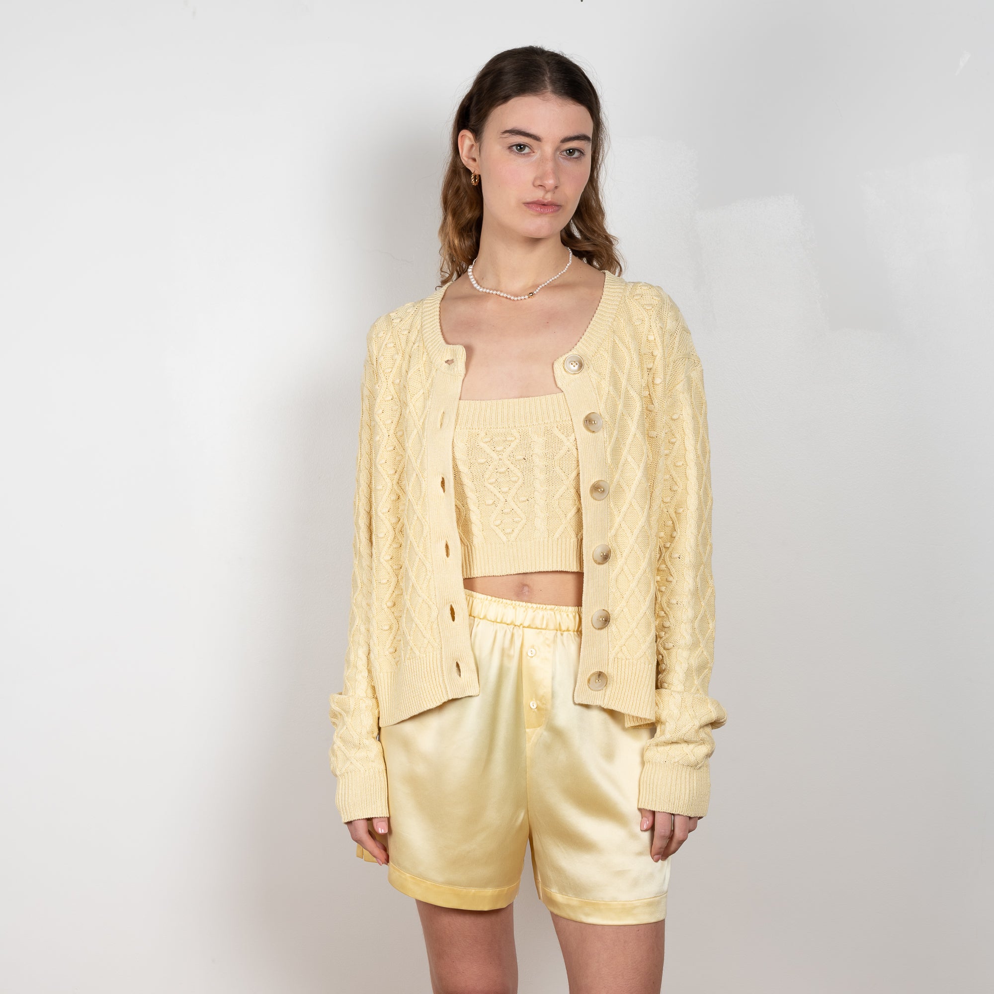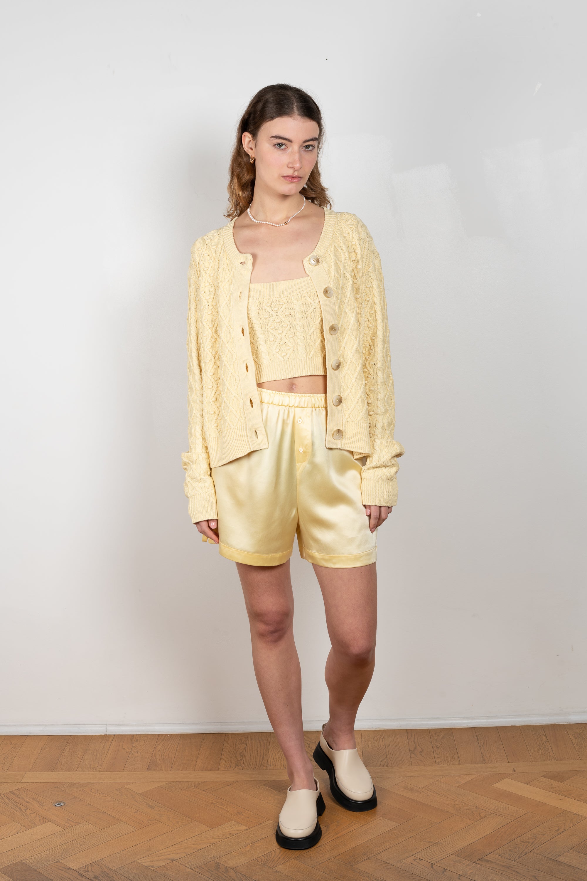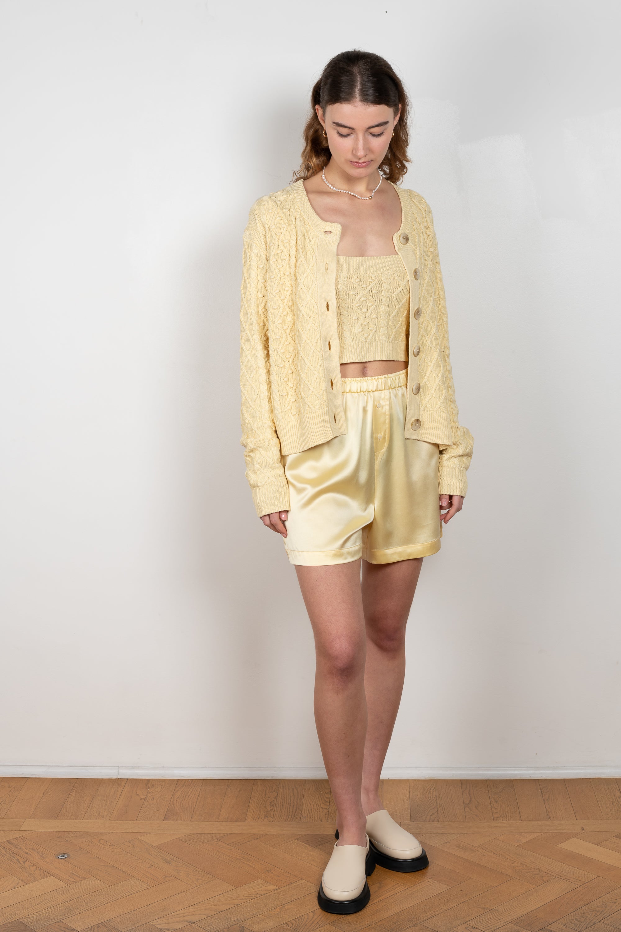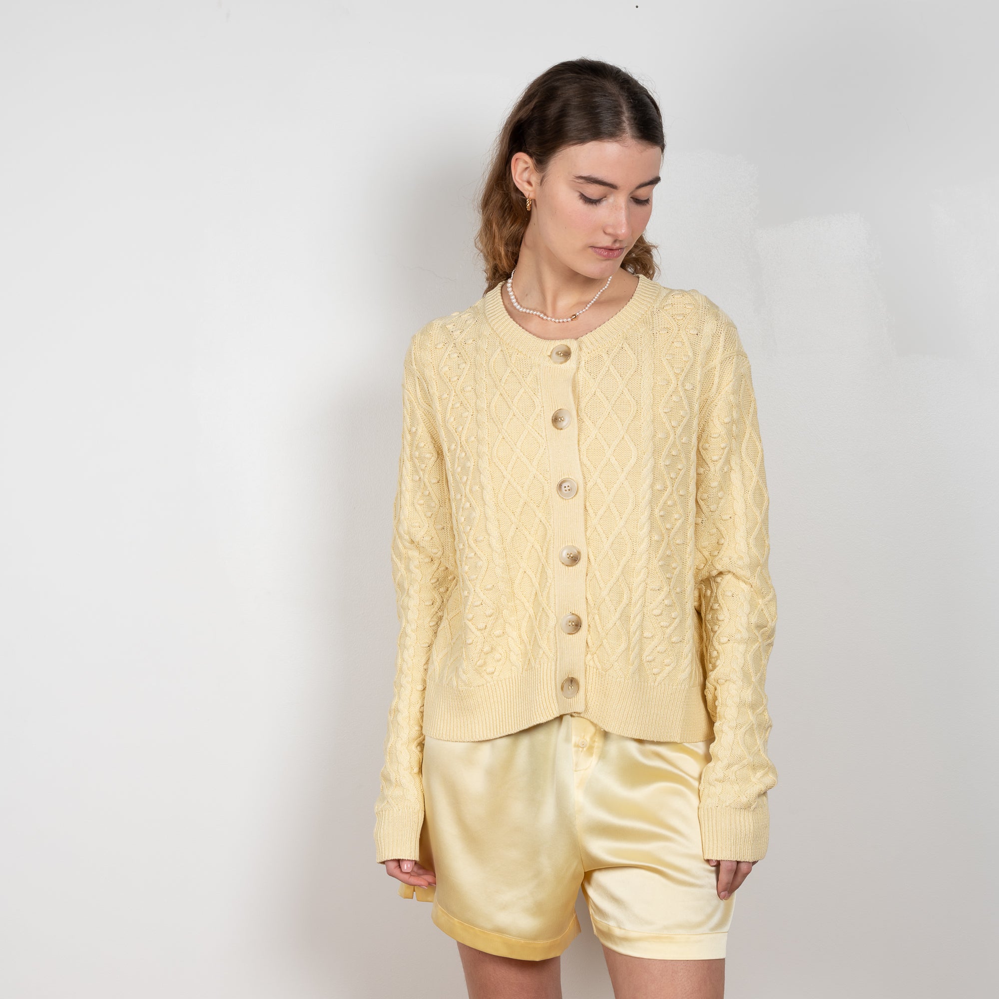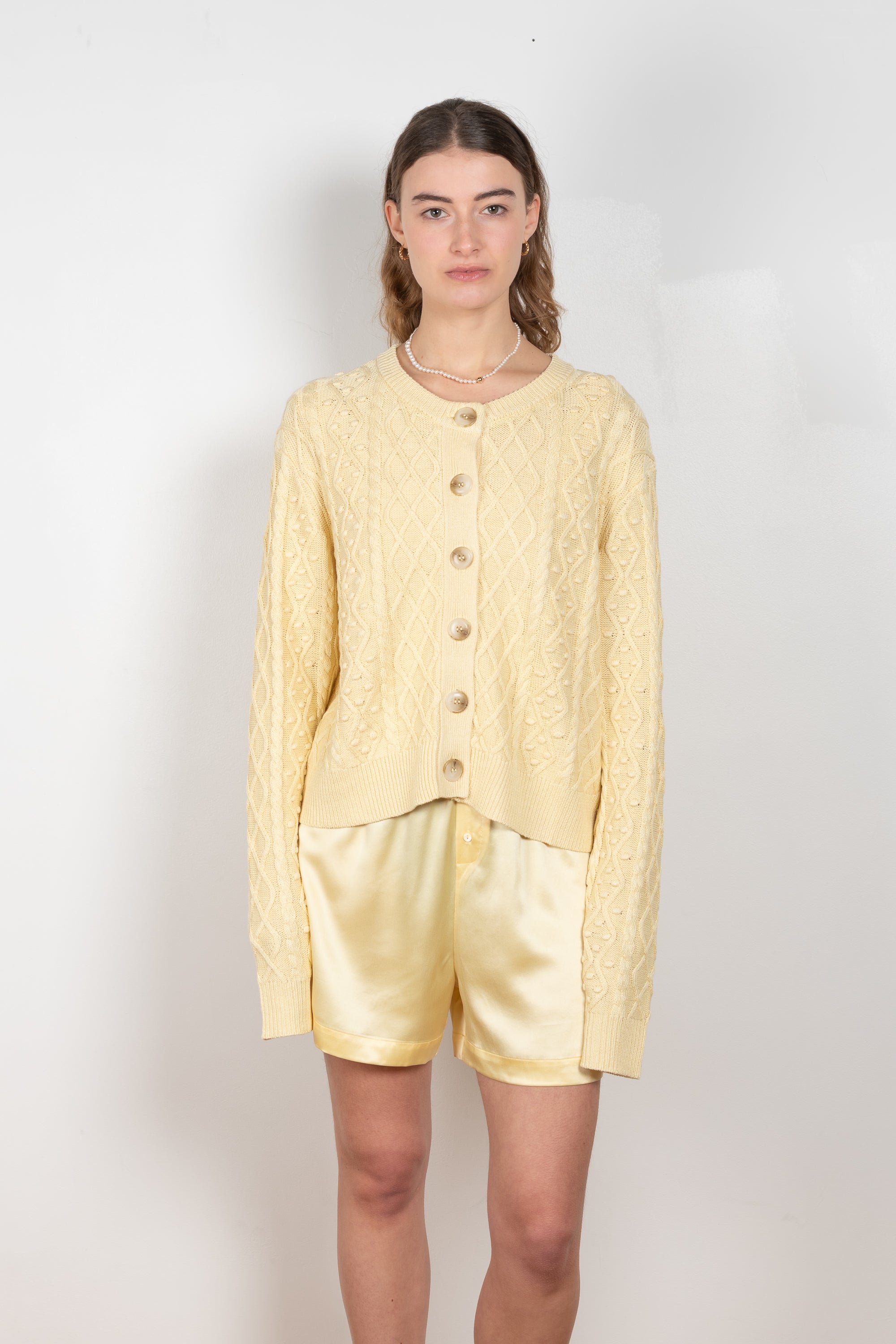 The Vilm Cardigan by Loulou Studio is a relaxed cardigan with a cable pattern in a soft and lightweight summer knit