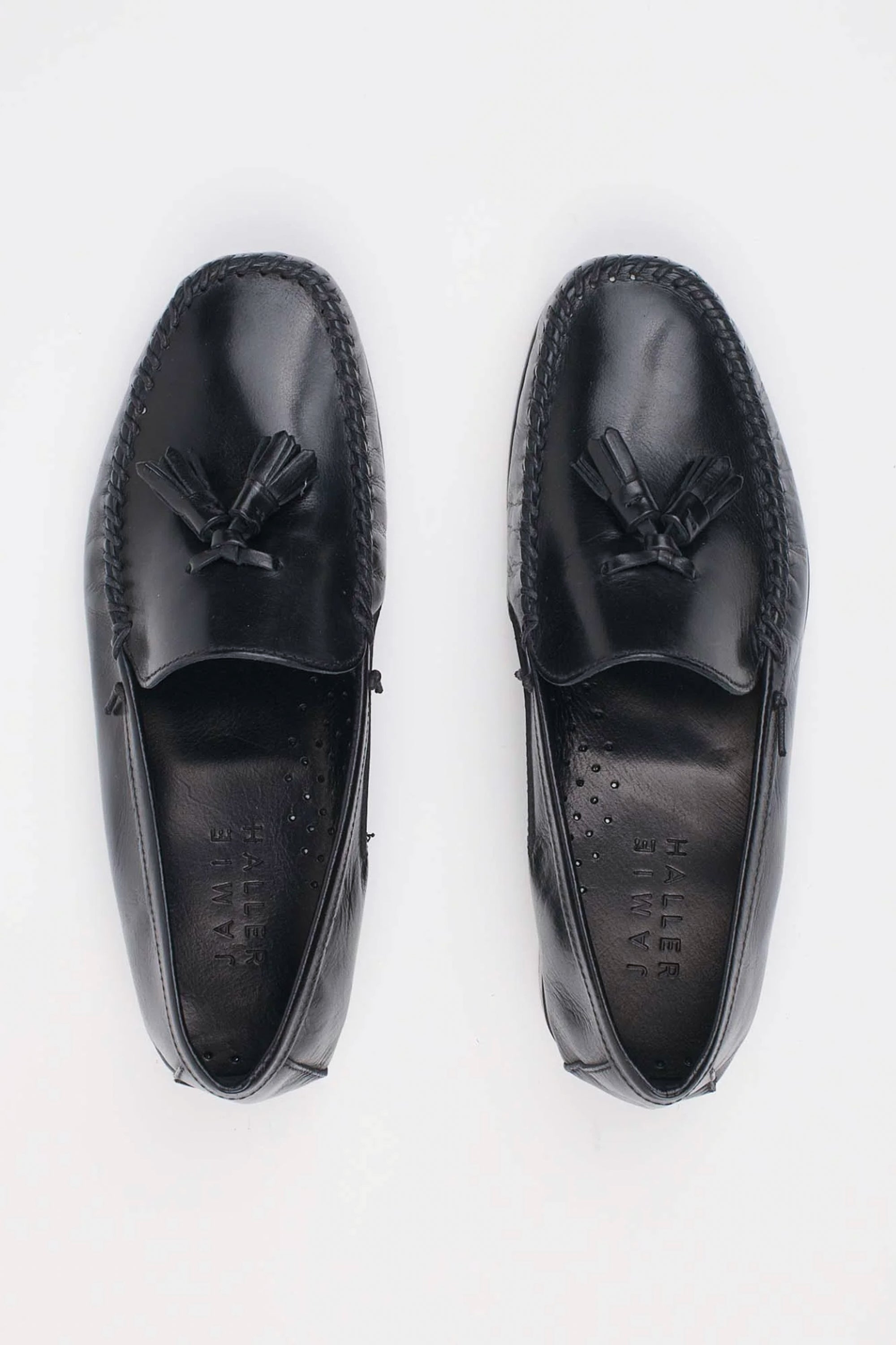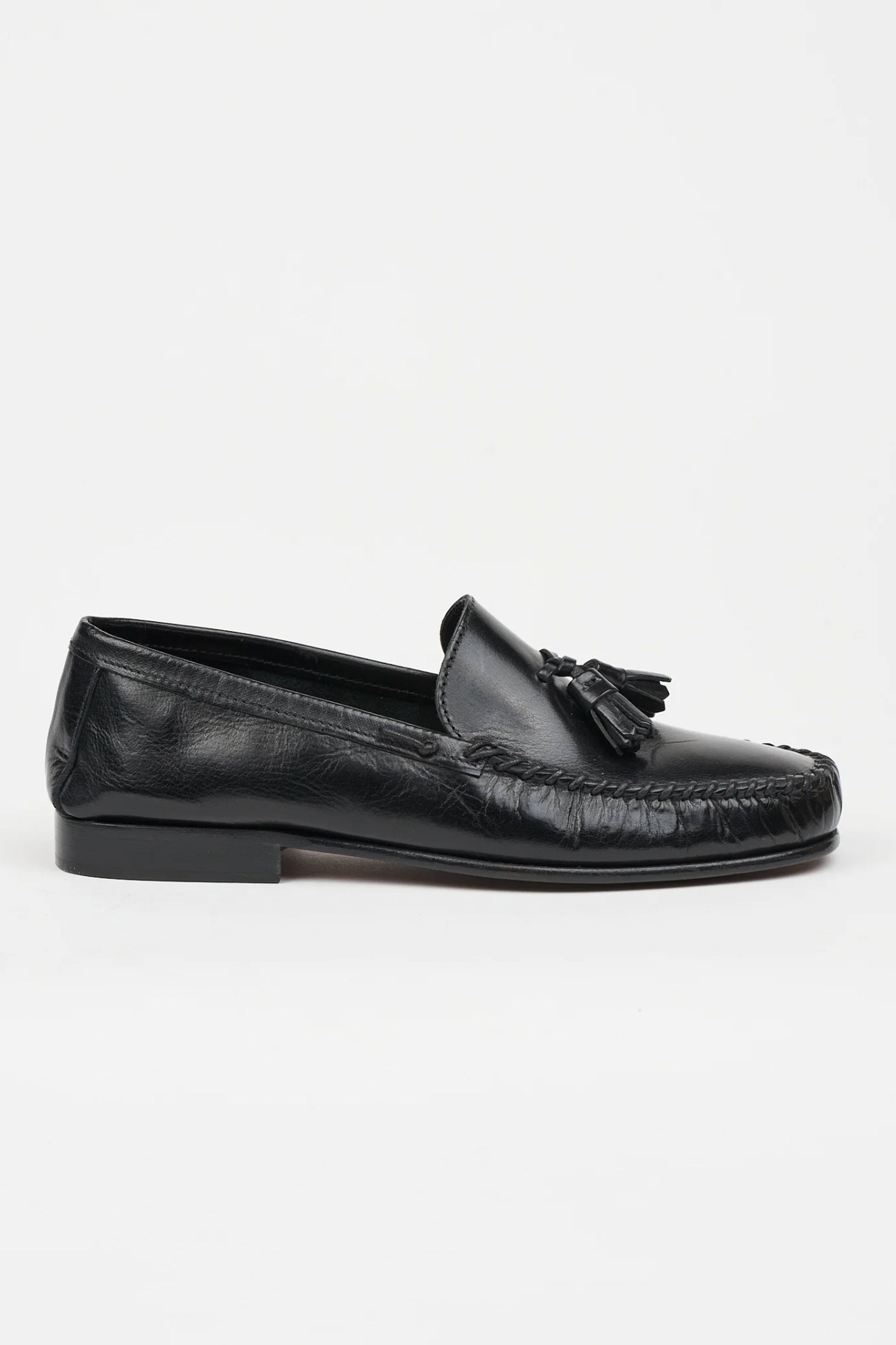 The Tasselo Moc by Jamie Haller combines the classic iconicism of a Loafer and the bohemian spirit of a mocassin with playful leather tassel . Moccasin construction with an oiled leather sole and handmade in Italian Buffalo with a sturdy heel.