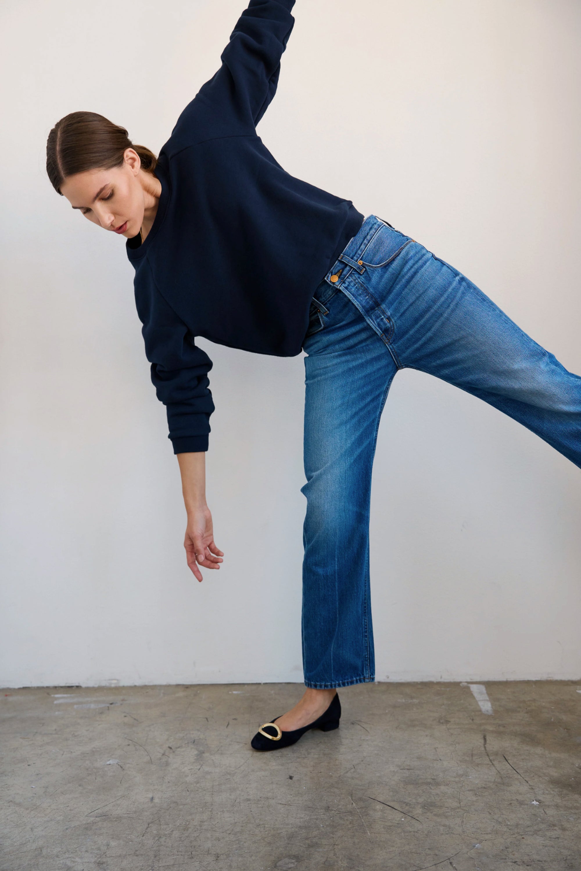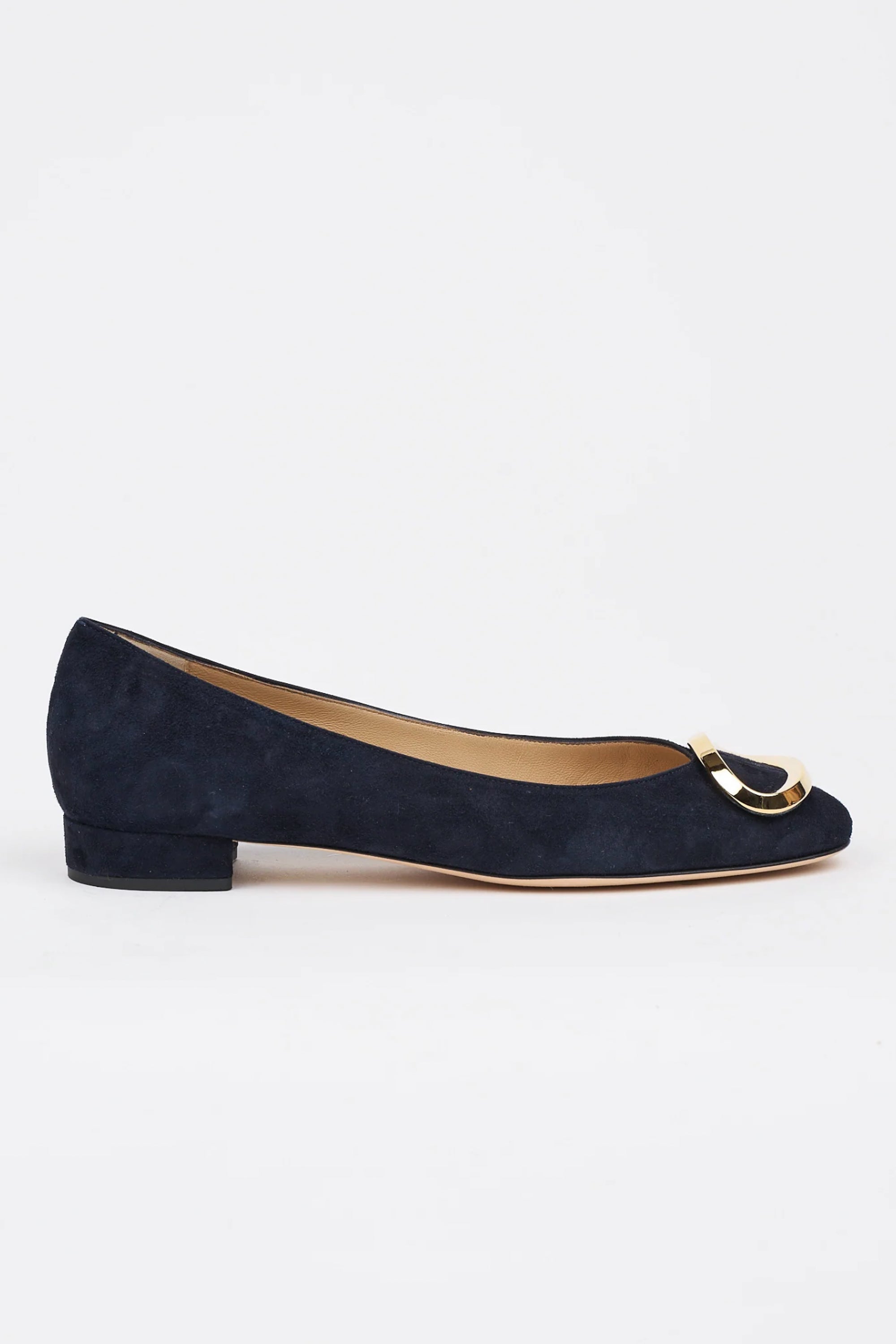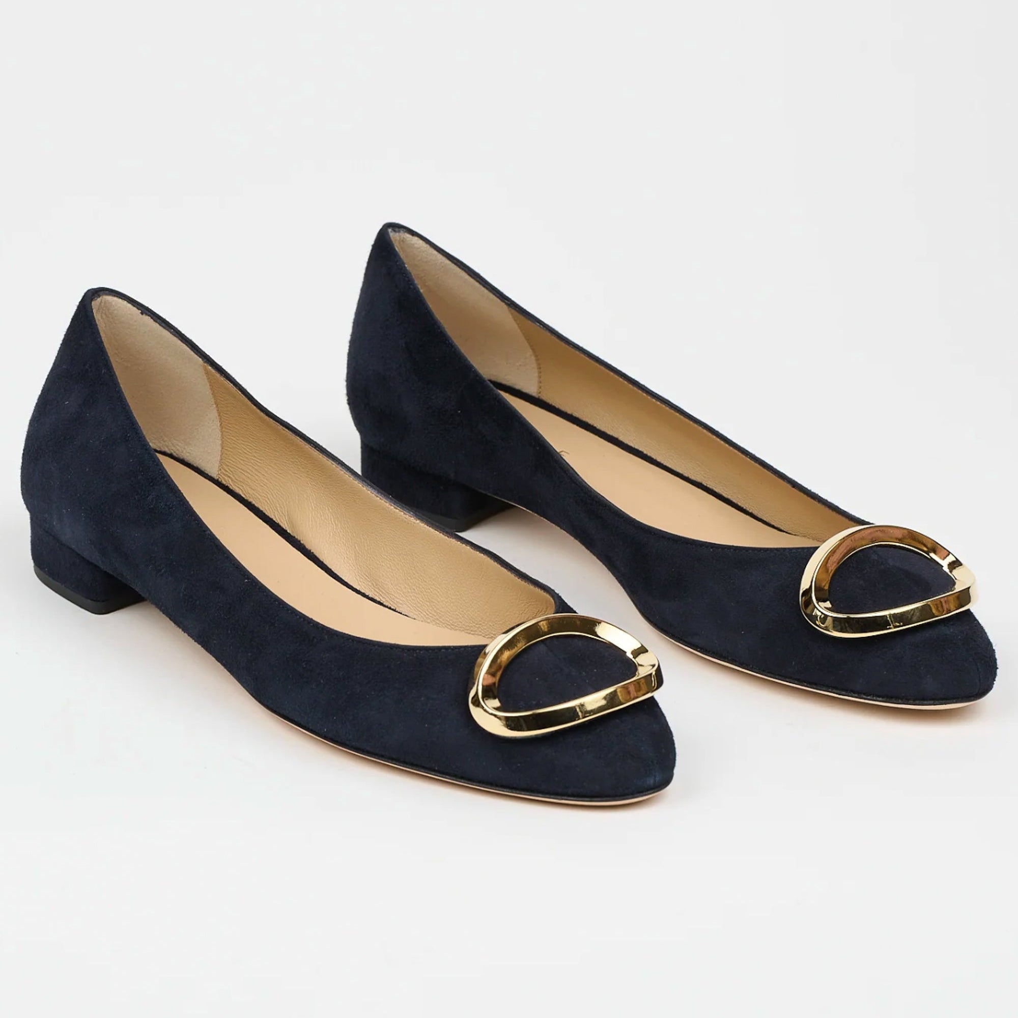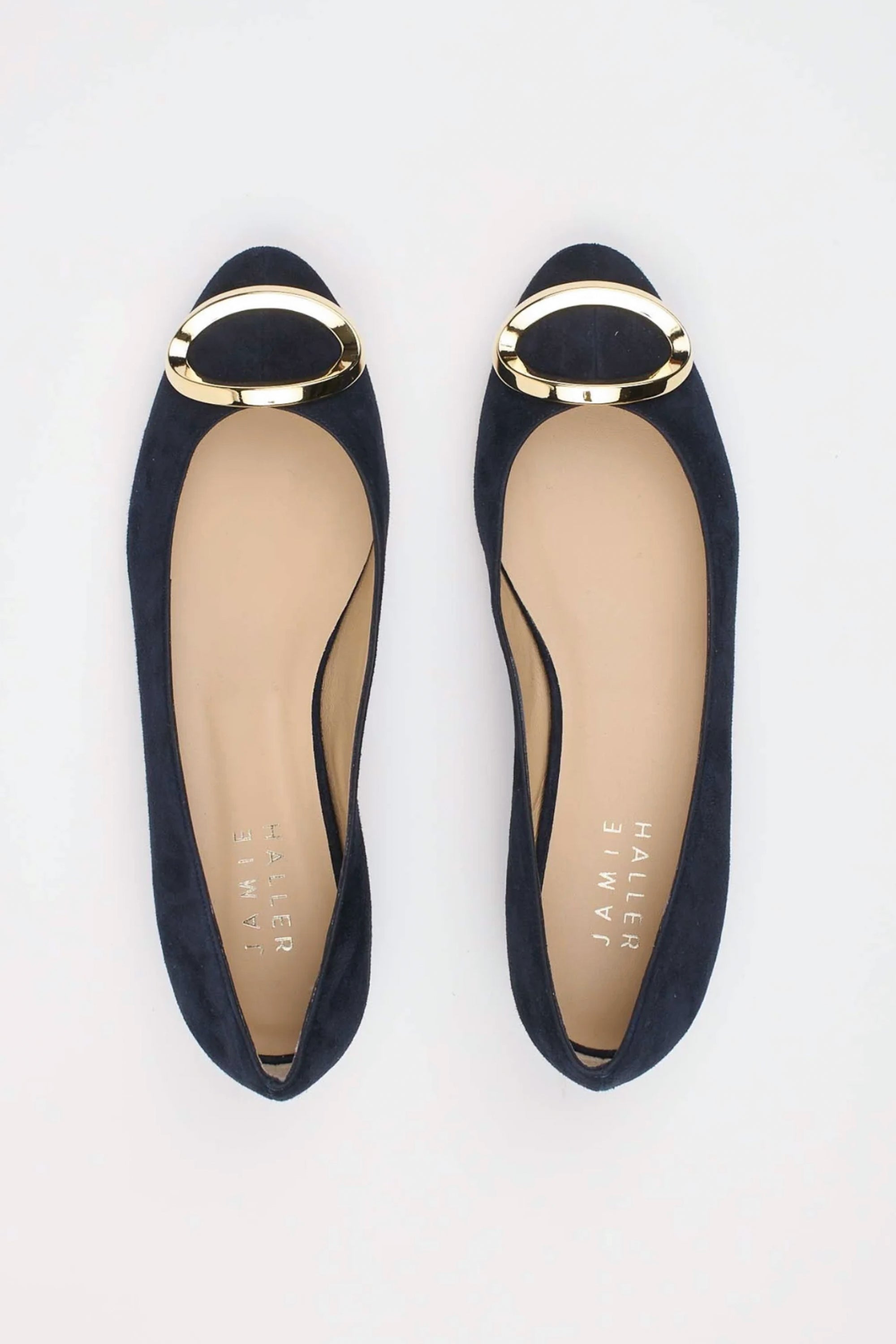 The Lady by Jamie Haller a new toe, soft and demur but cool. A low vamp and lady heel. Italian beautiful brass hardware in an organic oval. Handmade in Italian Suede with lamb lining.