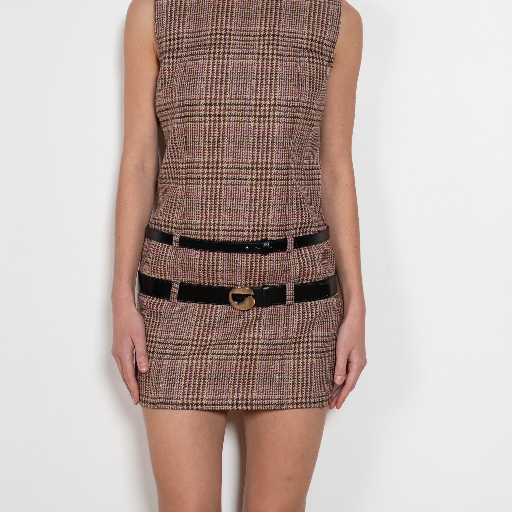 The Multi Belt Dress by Coperni is a sleeveless silhouette and skims the frame in cashmere-softened wool, while a duo of glossy leather belts wrap the waist and low hip. Polished buckles flicker like signals, so the line stays pure and the attitude lands charged.